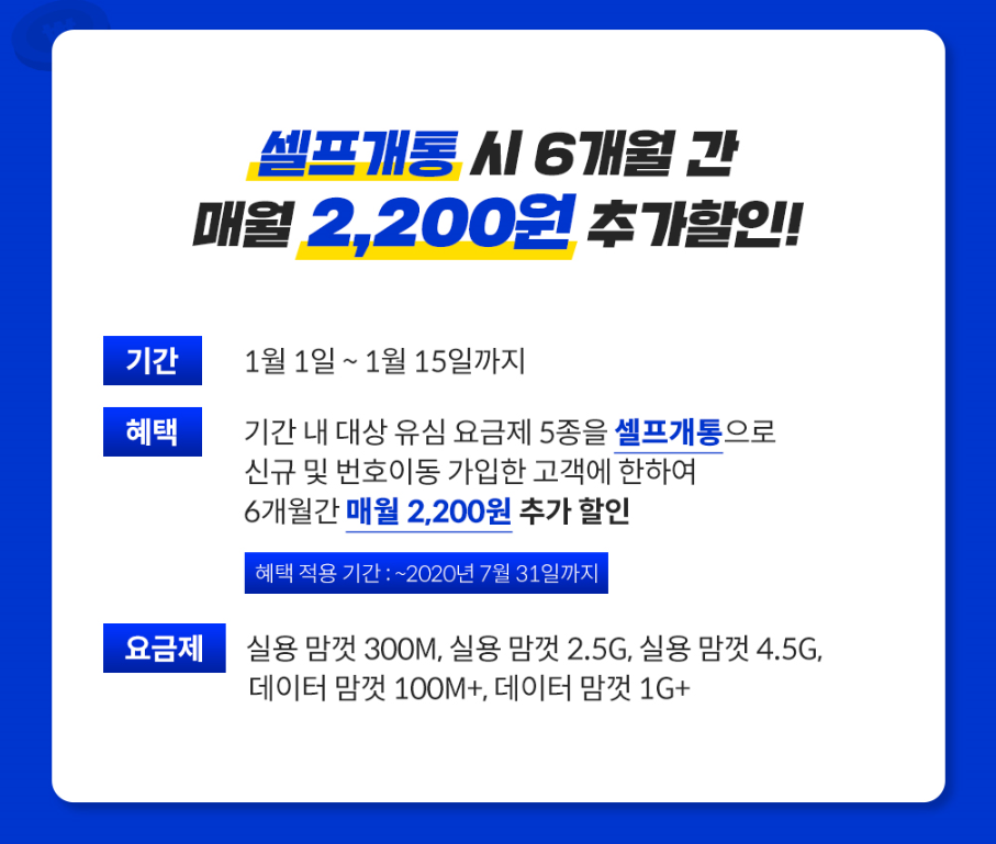 본인에게 맞춤형 요금제를 선택하여 1만원대 초반부터 중반가격으로 사용해 통신비 절감까지 가능한 kt엠모바일의 혜택은 셀프개통 추가할인으로 2,200원의 추가 할인까지 기대할 수 있습니다. 셀프개통의 경우 집근처 편의점이나 kt엠모바일 온라인 몰에서 유심을 구매하여 진행하면 방식으로 10분이면 끝낼 수 있어 놓치면 아쉬운 혜택인 만큼 통신비 절감을 고민하는 분들이라면 서둘러 kt엠모바일에 접속 모든 혜택을 누려보시기 바랍니다.
