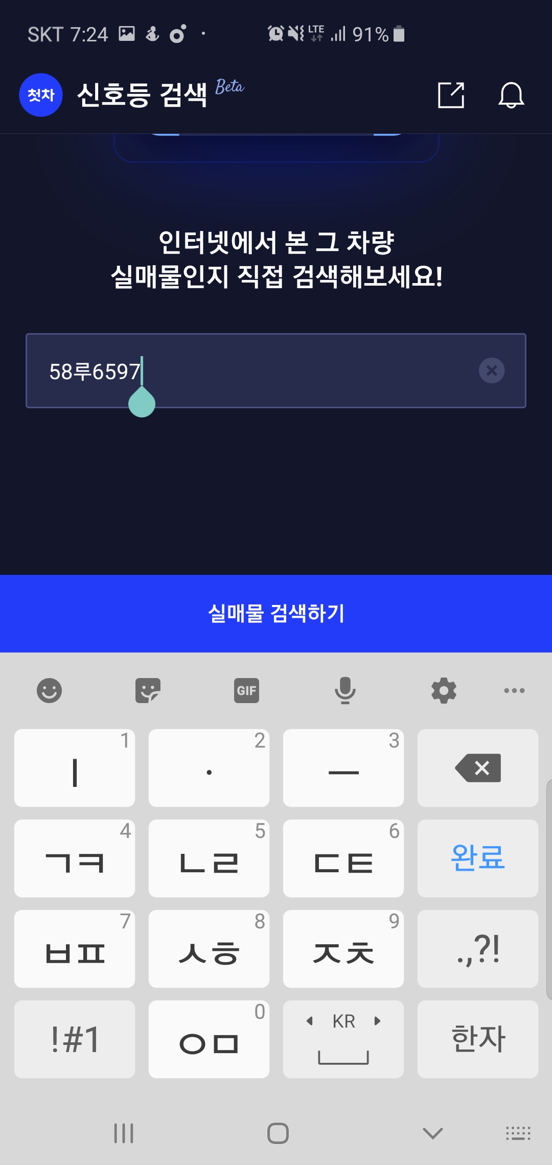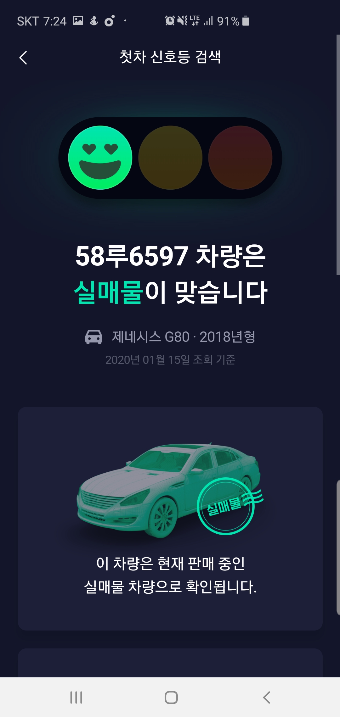 첫차 앱에서 신호등검색을 선택 접속하면 인터넷에서 본 그 차량 실매물인지 직접 검색하여 허위 매물을 판단할 수 있는서비스를 받을 수 있습니다. 기존에는 딜러에게 물어보거나 직접 실물을 확인해야 했던 부분들을 어디서든 간편하게 할 수 있도록 구성되어 편리합니다.