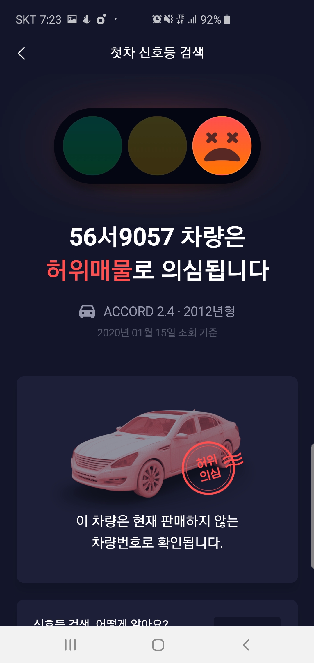 인터넷을 통해 검색 매물로 나온 중고차를 검색해 보았는데요, 차량 번호를 입력하고 조회 그리고 결과까지 그리 오랜 시간이 걸리지 않았습니다. 처음 검색한 차량부터 허위매물로 의심된다는 빨간색 신호등에 뒤도 돌아보지 않도 다음 차량을 확인해보았습니다.