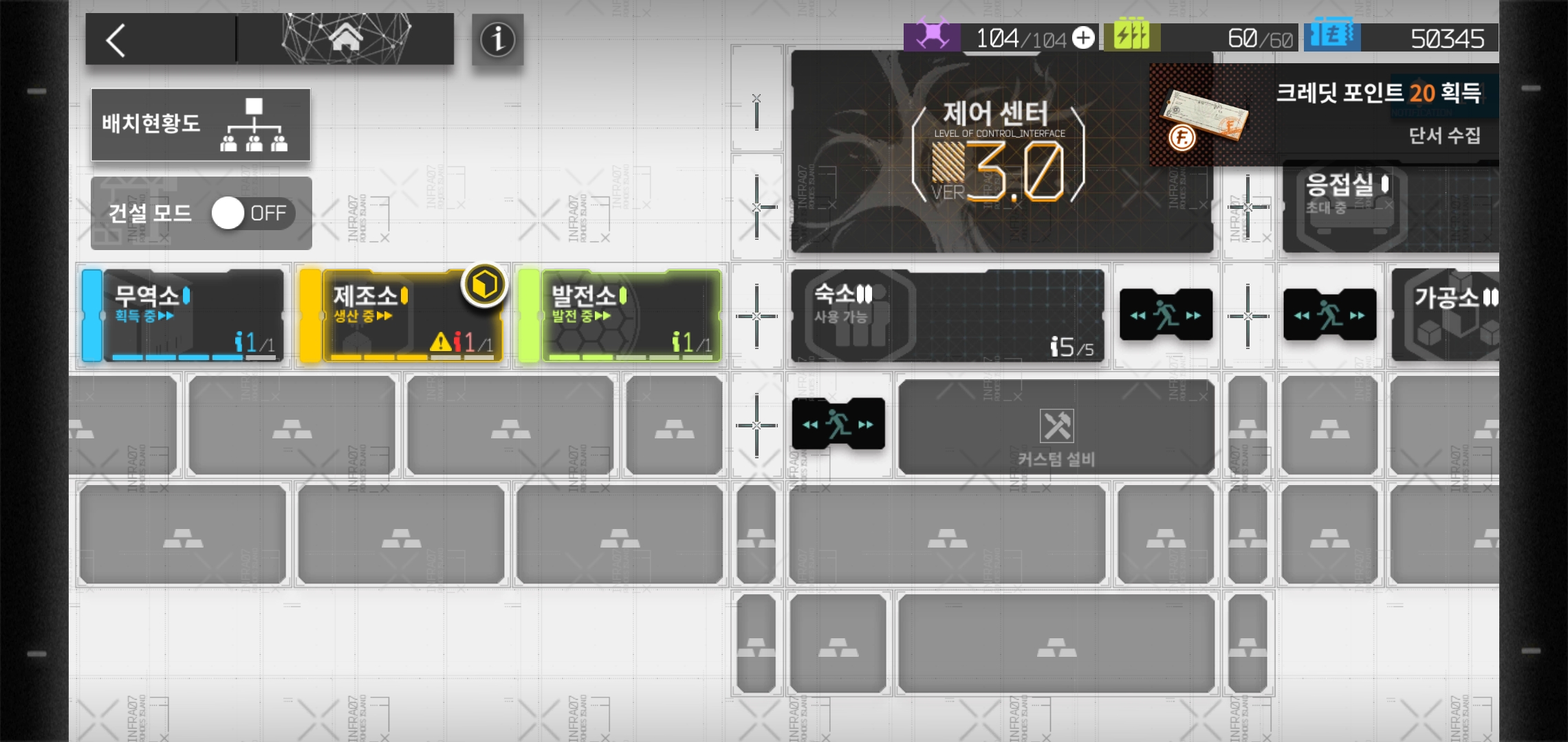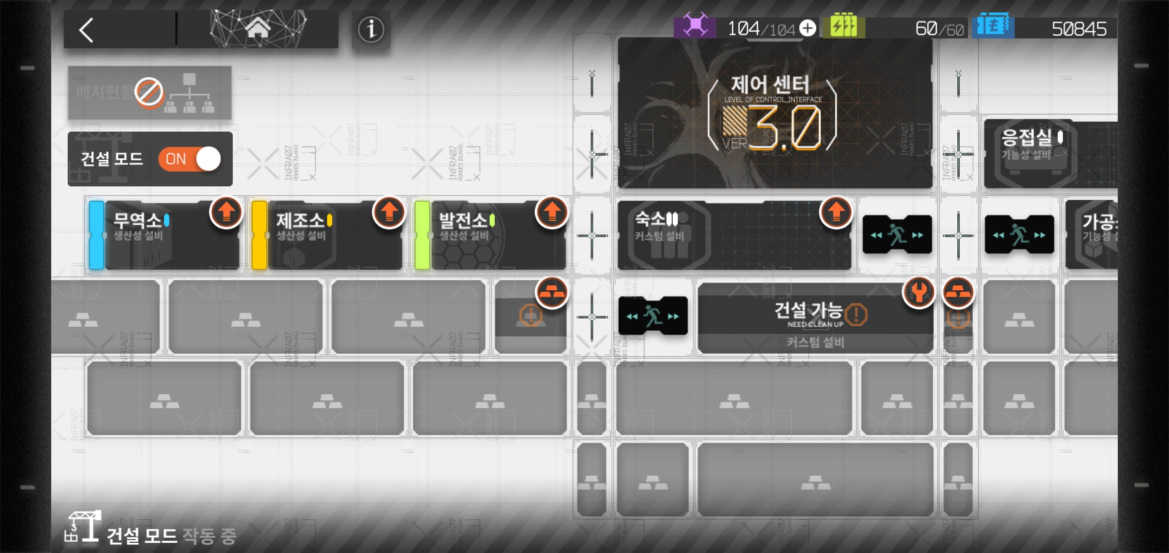메인화면 우측 하단에 보이는 기반시설을 클릭하면 제어센터를 기반으로 여러 시설들을 건설하고 관리할 수 있는 화면을 접하게 됩니다. 각각의 시설들의 경우 유기적으로 얽혀 있는 특징을 가지고 있습니다. 특히 시설을 업그레이드 할 수록 오퍼레이터 관리라던가 작전을 나서는 일에 도움을 받을 수 있어 그냥 지나칠 수 없는 부분이기도 합니다.