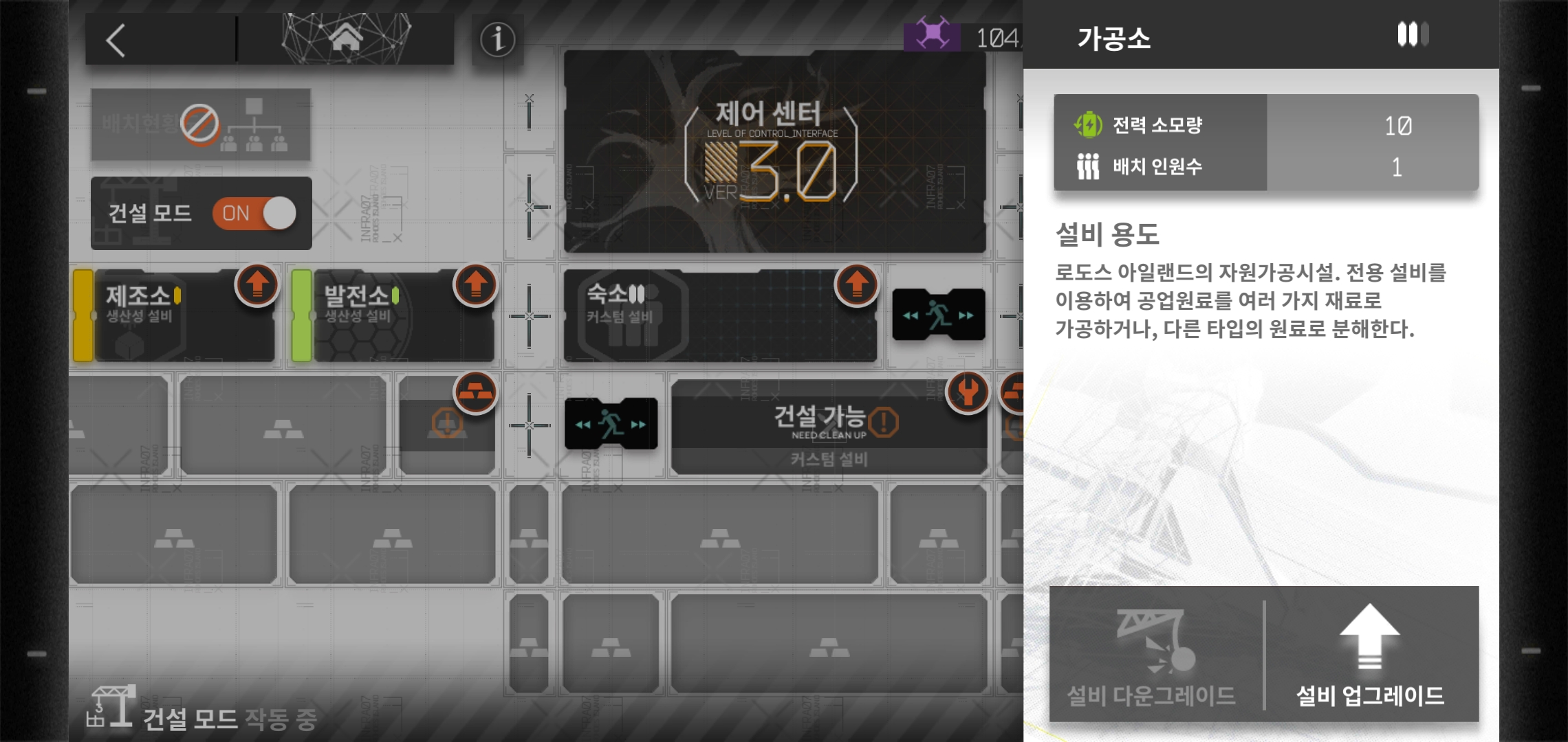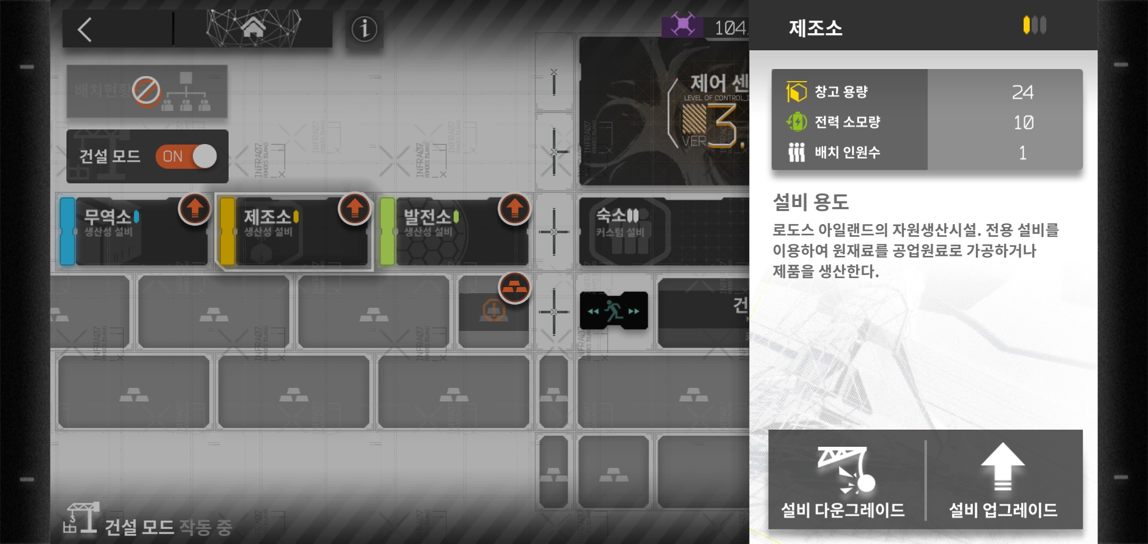 각 기반시설을 업그레이드 하기 위해선 왼쪽 상단 건설모드를 ON으로 놓아주어야만 진행 가능합니다. 제어센터를 기반으로 업그레이드 할 수 있는데다, 그에 필요한 아이템 제작도 가능하기 떄문에 제어센터를 1순위로 업그레이드 해주는 일은 기본이 된다고 할 수 있습니다.