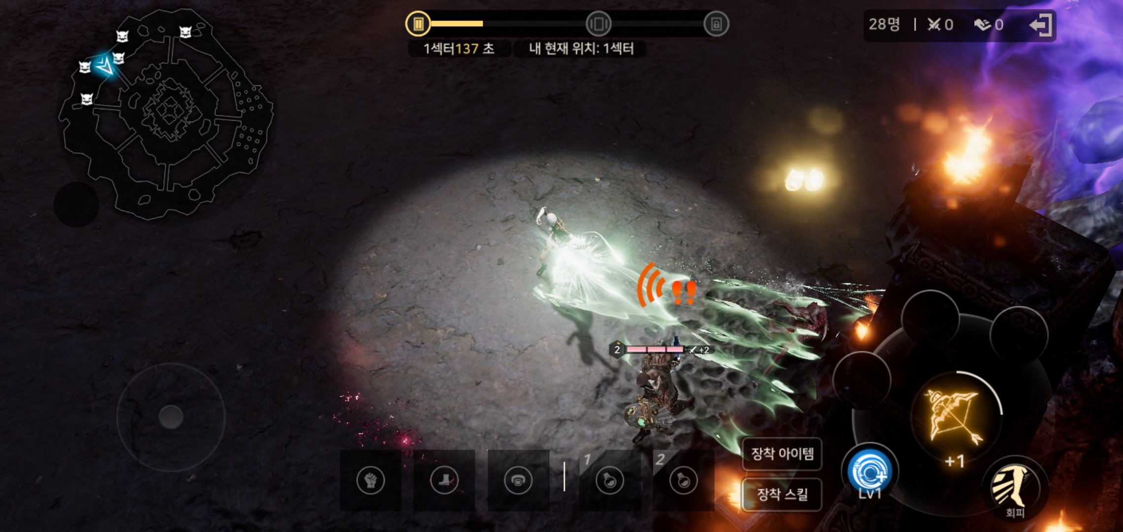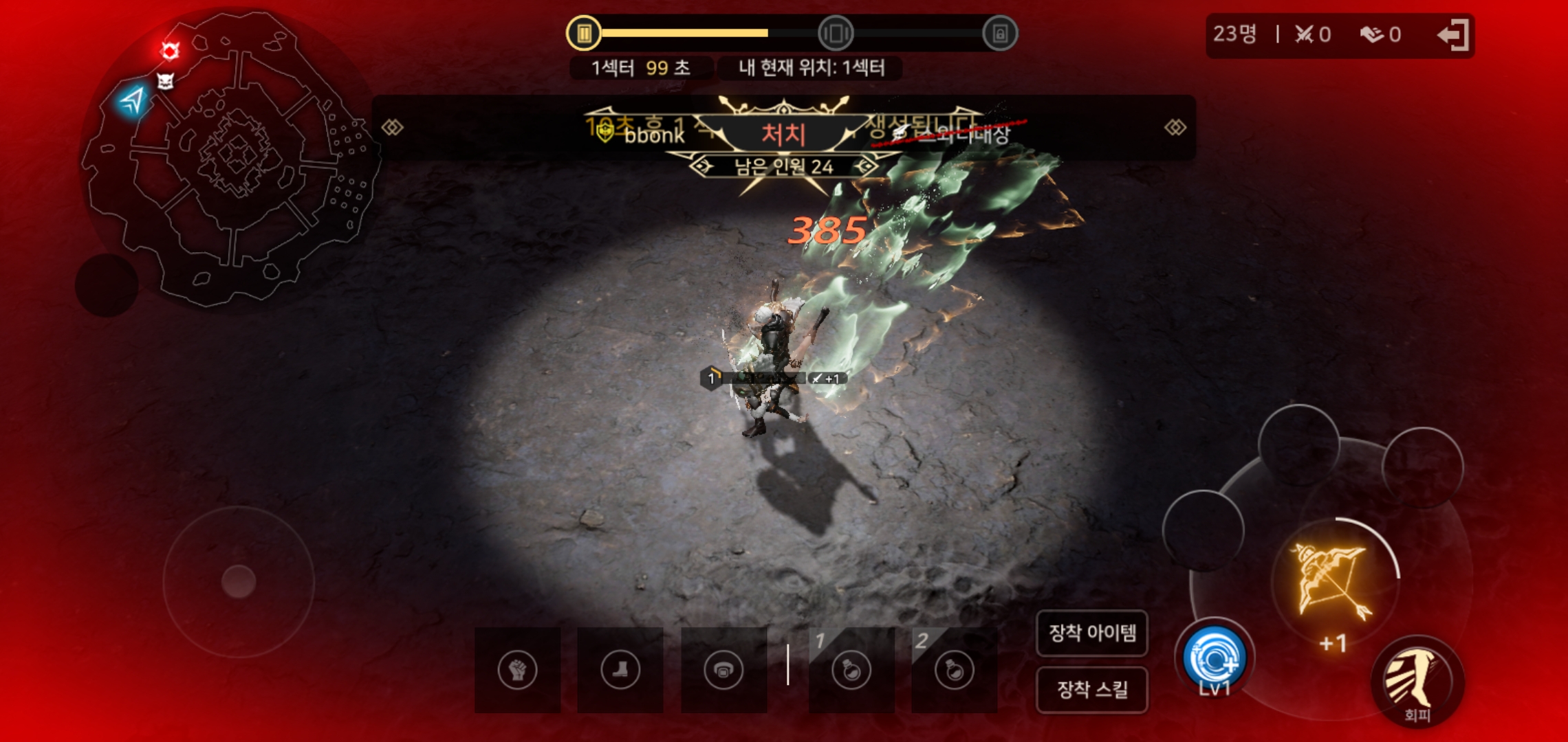 배틀로얄에 참가하는 인원은 특정 무기를 선택하고 1레벨부터 동시에 시작하게 되는데요, 몬스터 사냥부터 아이템 파밍, 다른 유저와의 전투까지 스테이지에서 모두 진행되어 극한의 긴장감과 몰입도를 즐길 수 있는 점이 특징입니다. 또한 시간이 지남에 따라 좁아지는 섹터에서 살아남기 위한 흥미 진진함은 지루함을 느낄 수 없을 정도였습니다.