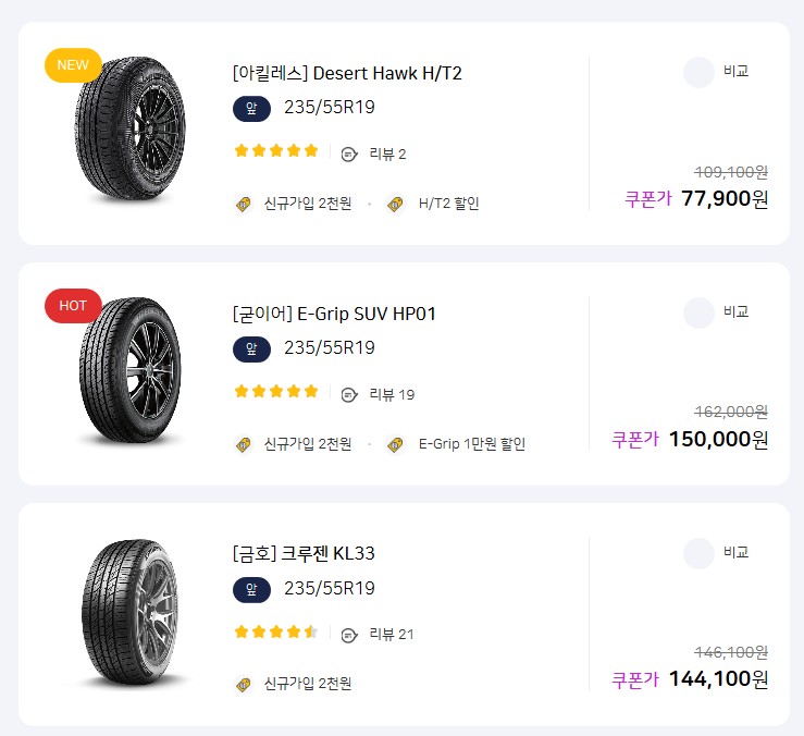 먼저 장착해본 분들의 리뷰라던가 평가를 보니 안전성부터, 승차감, 정숙성까지 모두 좋은 점수를 받고 있었습니다. 그리고 이렇게 합리적인 비용이 가능한 이유는 바로 타이어픽에서 진행되고 있는 타이어핫딜을 통해 쿠폰으로 할인받아 구매 가능하기 때문이더군요.