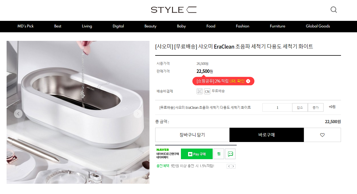 스타일씨를 통해 샤오미 EraClean 초음파 세척기를 구매할 경우 N페이 구매가 가능해 포인트 적립과 사용이 손쉬운 점외에 별도의 해외배송비가 추가로 부가되지 않는 점도 부담없이 구매할 수 있는 이유이기도 합니다. 2만원대로 구매하면 최대 되돌려 받을 수 있는 N페이 적립비용도 유용하고 말이죠.