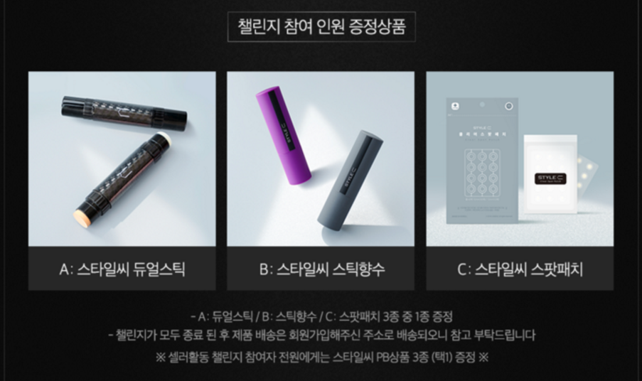 스타일씨 셀러 챌린지의 경우 참여 횟수에 상관없이 참여 인원 모두에게 PB상품인 스타일씨 듀얼스틱, 스틱향수, 스팟패치 3종 중 한가지를 선물로 증정한다고 하니 가볍게 도전해 봐도 좋을 것 같습니다. 최다 활동 셀러를 목표로 열심히 활동한다면 최고 매출 셀러도 가능하고 말이죠.