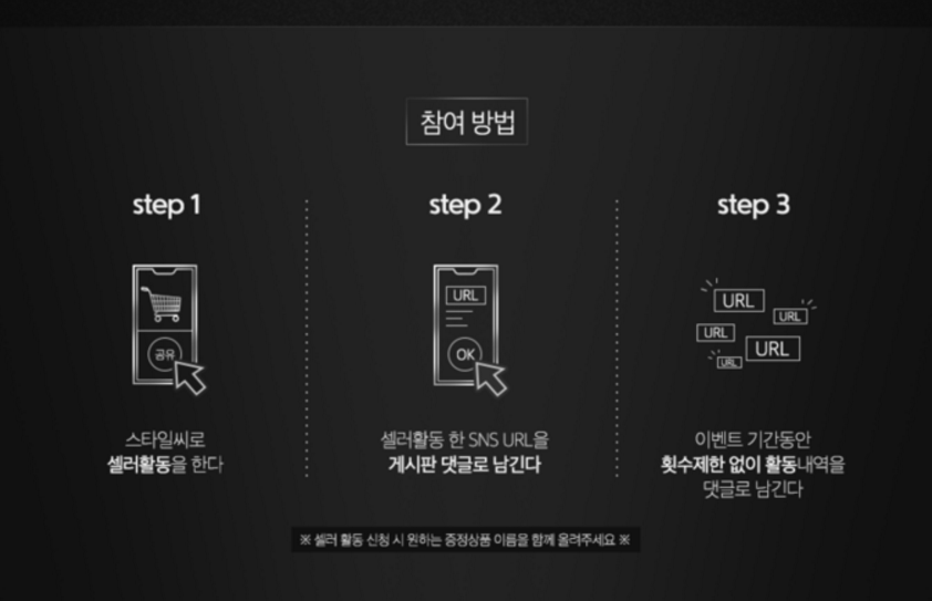 스타일씨 셀러 활동 이벤트에 참여하는 방법은 간단한데요, 스타일씨 셀러로 활동한 후 활동한 SNS URL을 공식카페 이벤트 게시물 하단 댓글로 남기는 방식입니다. 이벤트 기간 동안 회수 제한 없이 셀러 활동이 가능한데요, 활동만 하는 것에 그치지 않고 해당 내역을 이벤트 게시판에 댓글로 남겨야 합니다.