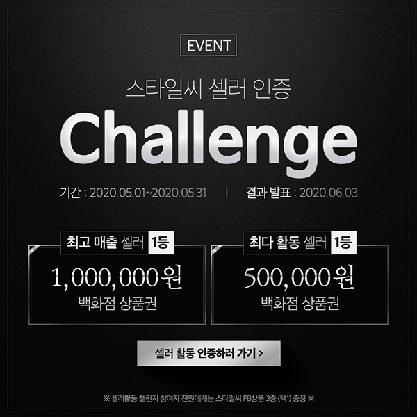 다양한 제품을 합리적인 가격으로 구매가능한 스타일씨에서는 5월 31일까지 셀러 인증 이벤트가 진행 중입니다. 최고 매출 셀러 1명에게는 100만원 백화점 상품권이 주어지고, 최다 활동 셀러에게는 50만원 백화점 상품권이 주어져 많은 셀러들의 도전을 기다리고 있습니다.