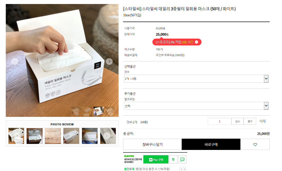 마스크는 이제 일상생활에 없어서는 안되는 제품이라고 해도 과언이 아닌데요, 반영구적으로 사용할 수 없는 제품인 만큼 비용적인 면을 고려하지 않을 수 없습니다. 스타일씨에서 판매되고 있는 데일리 3중필터 일회용 마스크는 50매 벌크 포장으로 2만원대 비용으로 구매 가능하고 쇼핑공유를 통해 구매 비용의 2%에 해당 되는 금액도 적립이 가능해 경제적입니다.