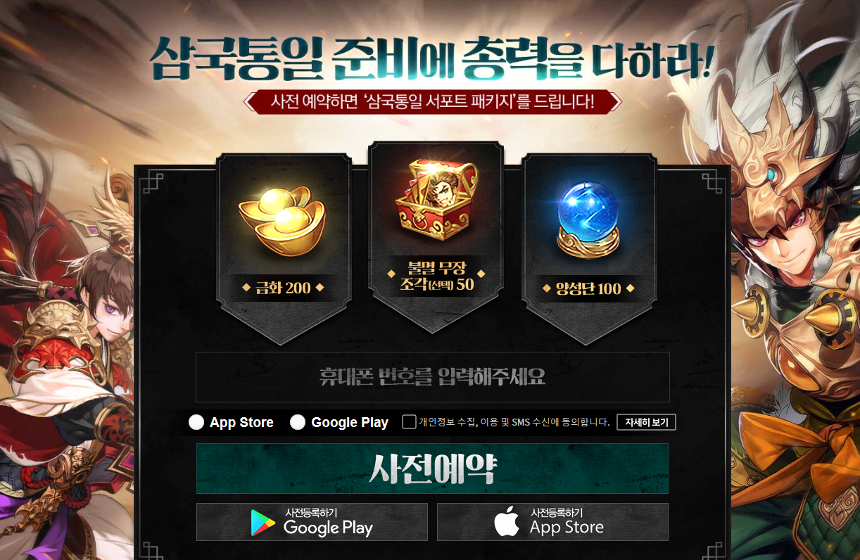 그랑삼국 모바일게임 사전예약은 정식 런칭까지 진행됩니다. 본인이 사용하는 OS에 따라 앱스토어 또는 구글플레이를 선택하고, 휴대폰 번호만 입력하면 간단히 참여 가능하며, 참여한 모든 인원에게 금화 200. 불멸 무장 조각 (선택)50, 영성단 100개를 지급합니다.