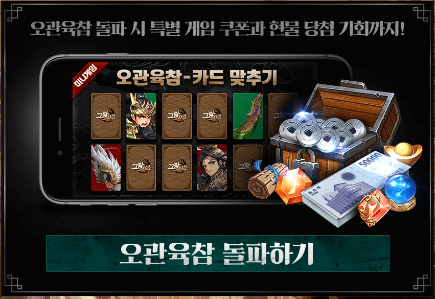 미니게임도 준비되어 있는데요, 사전예약에 참여하고 오관육참을 돌파하면 런칭후 사용 가능한 인게임 아이템들을 지급하는데요, 오관육참 카드 맞추기 인증을 공식카페를 통해 진행하면 신세계 상품권 5만원을 추첨을 통해 선물로 지급해 놓치면 아쉬울 것 같습니다.