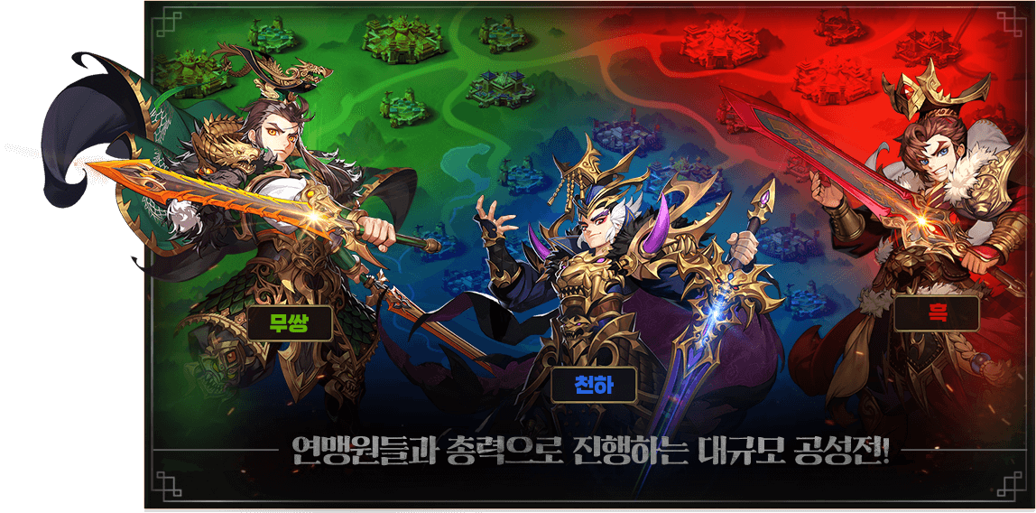 보유한 장수들의 출전 없이도 협공 스킬을 통한 강한 전투력 외에도 협력 출전만 해도 인연 버프를 활성화 하여 전투력을 올려주는 점 또한 그랑삼국의 매력이기도 합니다. 여기에 삼국지 하면 빠지지 않는 대규모 전투에 부분에 있어서도, 연맹원들과 총력으로 진행하는 공성전이 준비되어 있어 천하제패를 위한 지루할틈 없는 플레이가 이어질 것으로 예상됩니다.