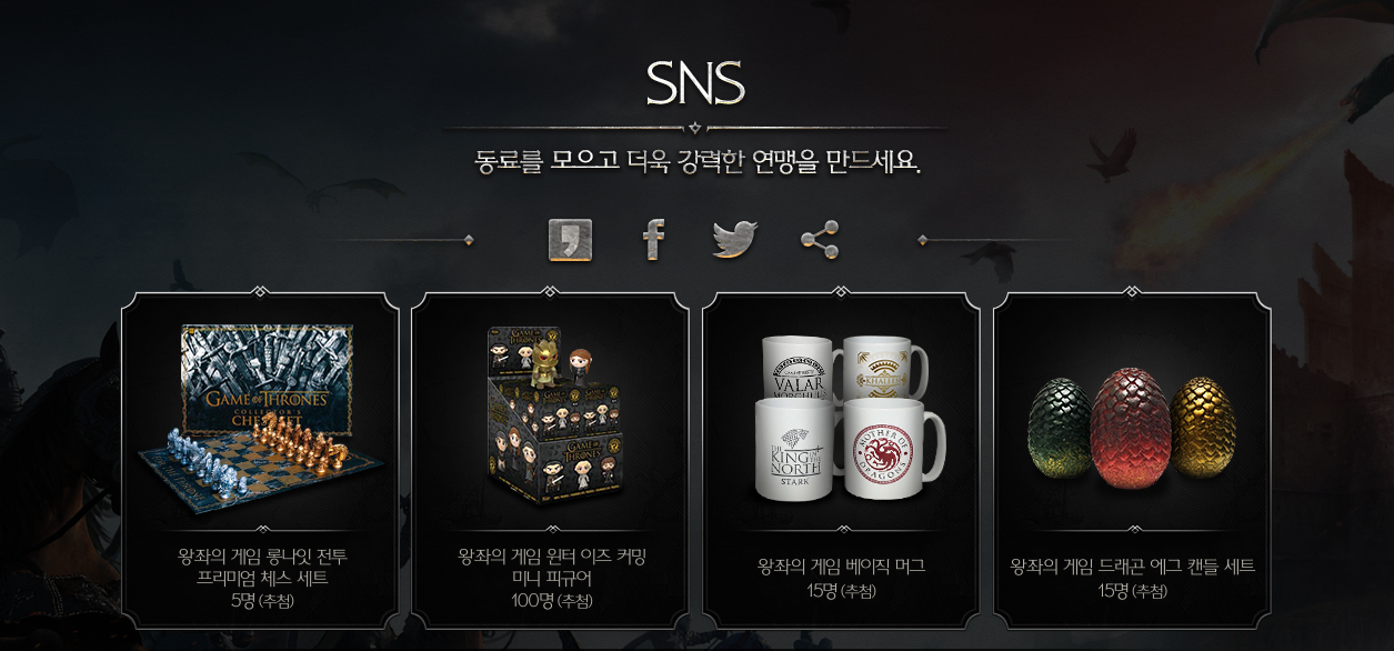 왕좌의게임 하면 강력한 연맹을 빼 놓을 수 없는데요, 사전예약이 진행됨과 동시에 강력한 연맹을 만들기 위한 동료를 모을 수 있는 SNS 이벤트가 진행 중입니다. SNS채널이나 공유 URL을 통해 #왕좌의게임 해시태그를 포함해 공유하면 추첨을 통해 체스 세트를 비롯해 머그컵, 미니피규어, 캔들세트에 이르는 풍성한 선물을 받을 수 있습니다.