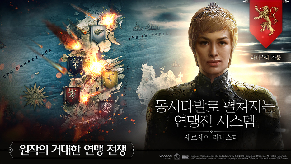 왕좌의 게임 칠왕국의 대립과 전쟁은 왕좌의게임 : 윈터이즈커밍에 담겨 대규모 전쟁의 긴장감을 느낄 수 있도록 구성되어 있기도 합니다. 가문간 공성 전투 시스템을 바탕으로 글로벌 전쟁과 거대 서버 대전을 즐길 수 있고, 동시다발로 펼쳐지는 연맹전 시스템을 통해 원작의 거대한 연맹전쟁까지 고스란히 담고 있습니다.