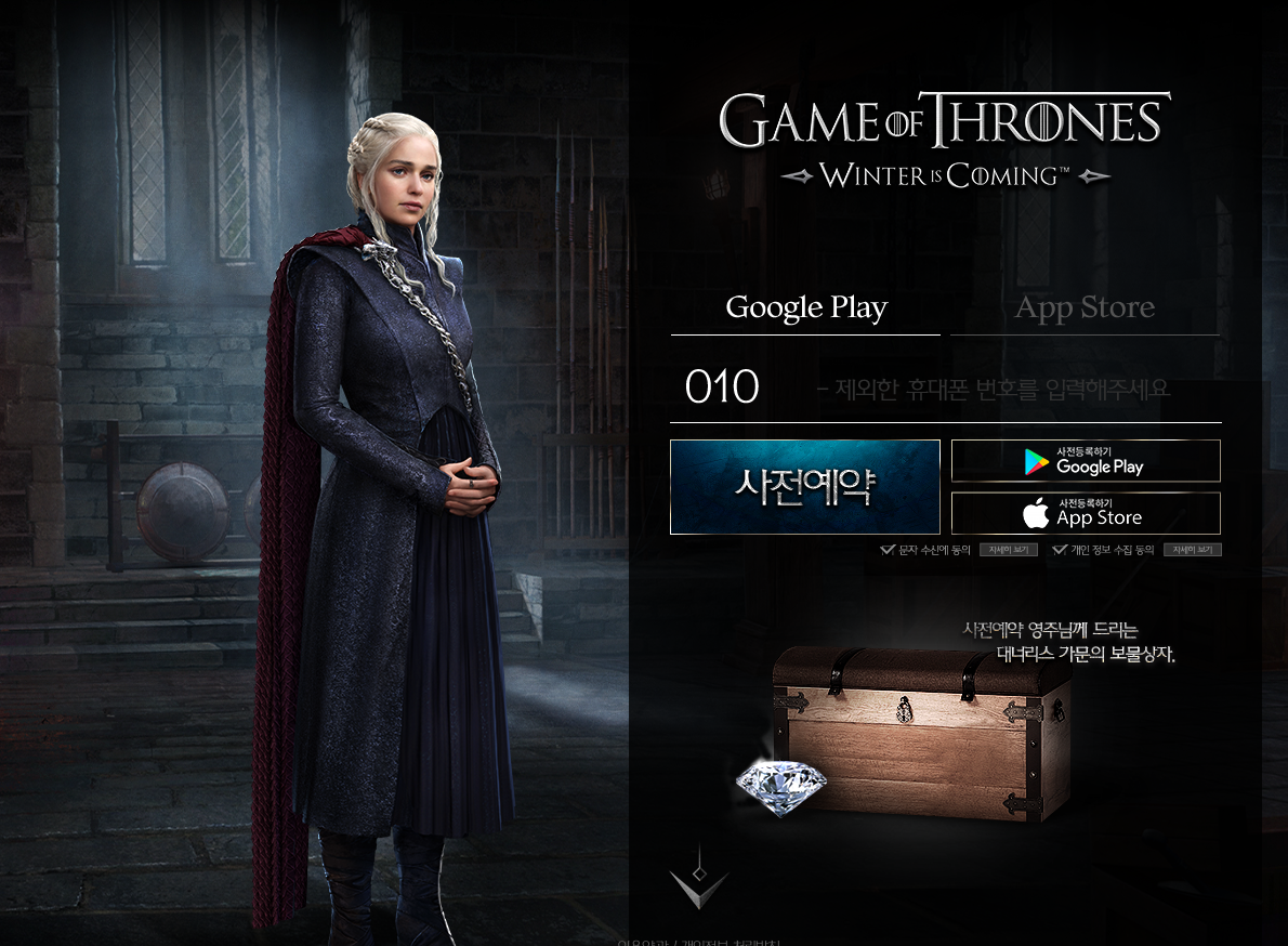 왕좌의게임 : 윈터이즈커밍은 공식런칭을 앞두고 사전예약이 한창 진행 중입니다. 사전예약 페이지에 등장하는 폴풍의 딸 대너리스 타르가르옌의 모습이 무척이나 인상적인데요, 본인이 사용하는 OS를 선택하고 휴대폰 번호만 입력하면 별다른 어려움 없이 진행 가능합니다. 또한 사전예약에 참여한 모든 유저에게는 대너리스 가문의 보물상자가 선물로 주어집니다.