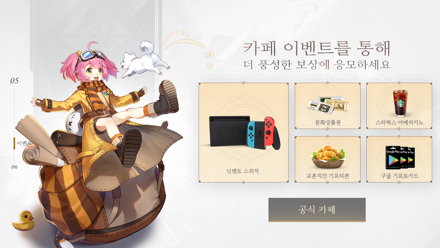 사전예약 이벤트외에도 공식카페를 통해 풍성한 선물을 받을 수 있는 이벤트가 진행 중입니다. 공식카페에 가입하고 댓글만 달아도 추첨을 통해 닌텐도 스위치를 비롯한 문화상품권, 스타벅스 아메리카노, 교촌치킨 기프티콘, 구글기프트카드를 받을 수 있으니 서둘러 사전예약도 참여하고 공식카페 이벤트도 참여해 선물의 주인공이 되어 보시길 바랍니다.
