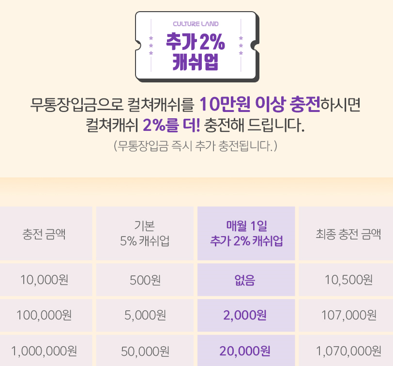 무통장입금을 통한 컬쳐캐쉬를 충전할 경우 언제 충전을 하더라도 기본 5% 캐쉬업은 기본적으로 주어집니다. 여기에 매월 1일 10만원 이상 충전을 할 경우엔 추가 2%에 해당하는 컬쳐캐쉬를 추가로 받을 수 있는데요, 캐쉬업을 반영한 비용을 정리해보면 기존 충전금액보다 훨씬 많은 7%의 캐쉬업을 받을 수 있어 백화점상품권 구매나 주유권 구매시 생기는 수수료를 상계할 수 있어 유용합니다.