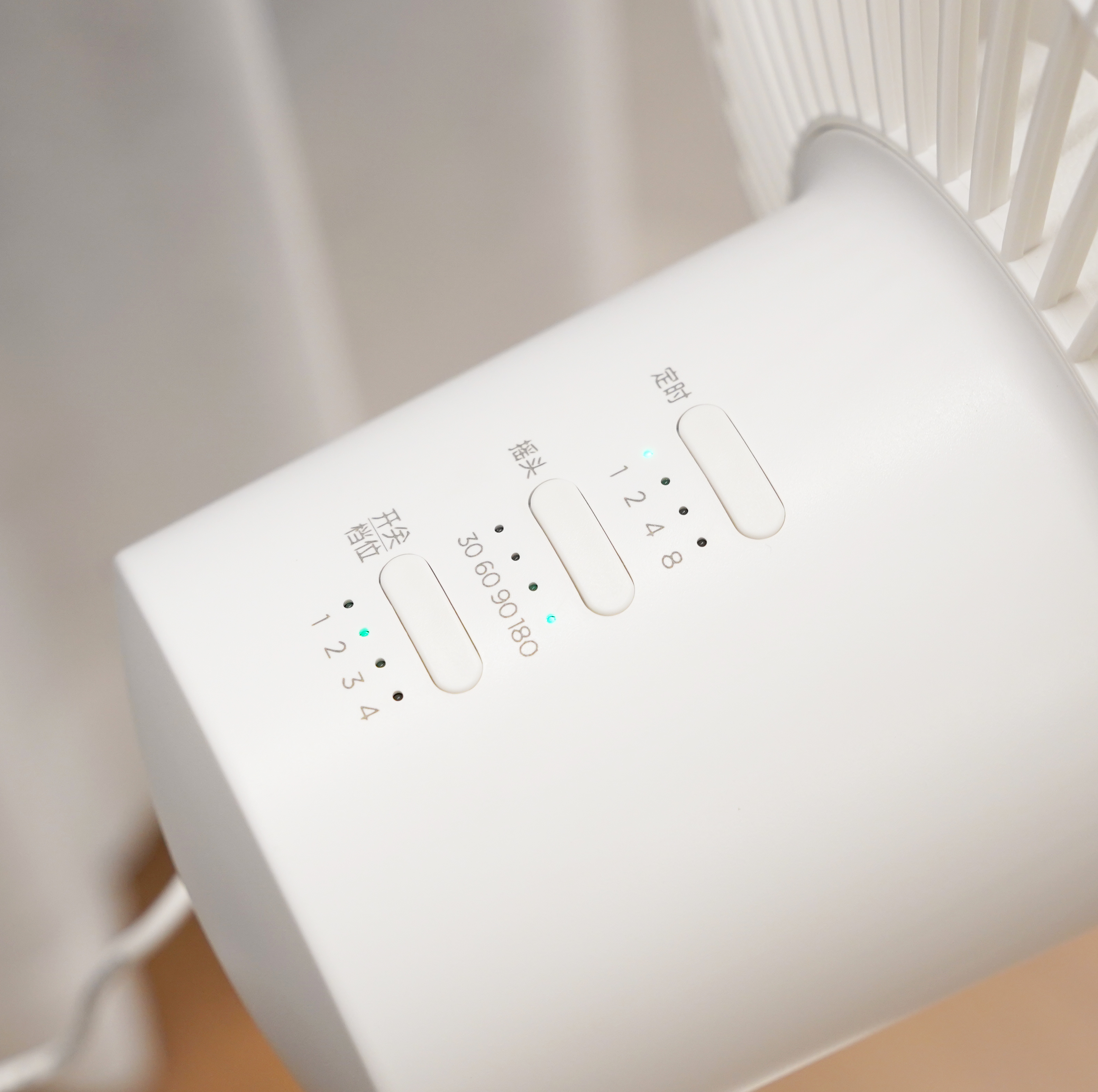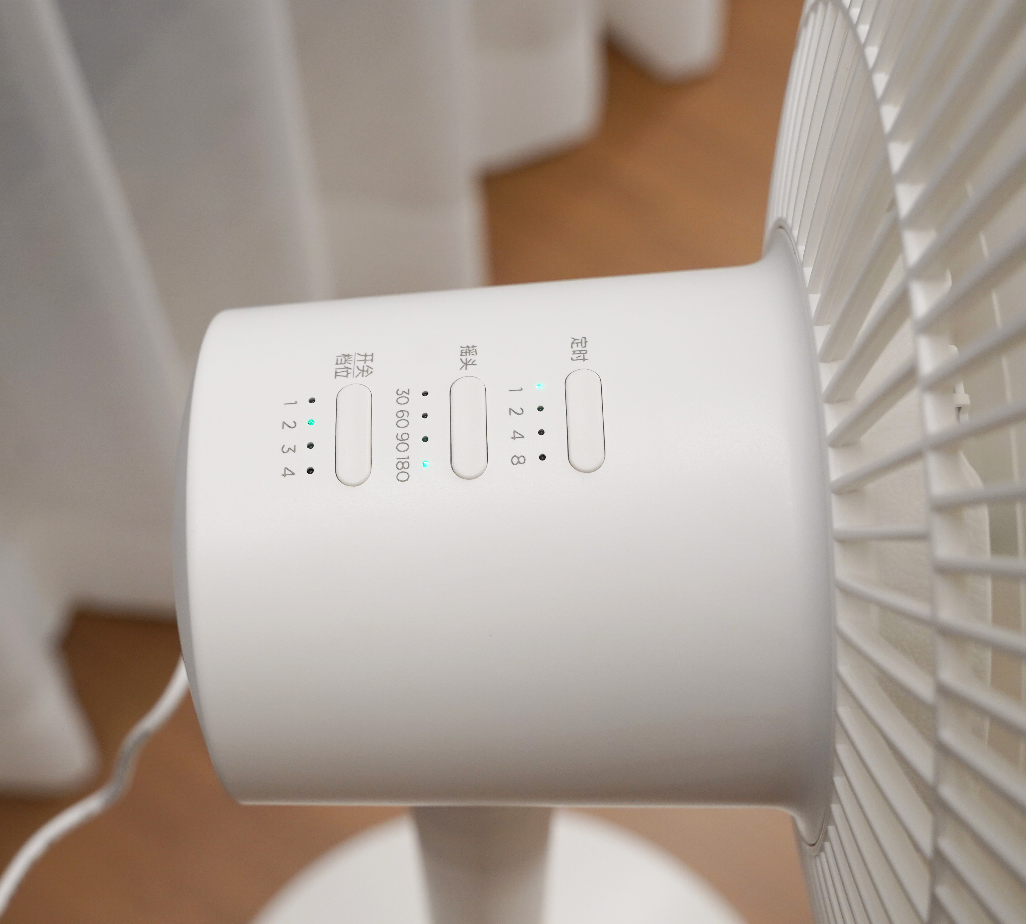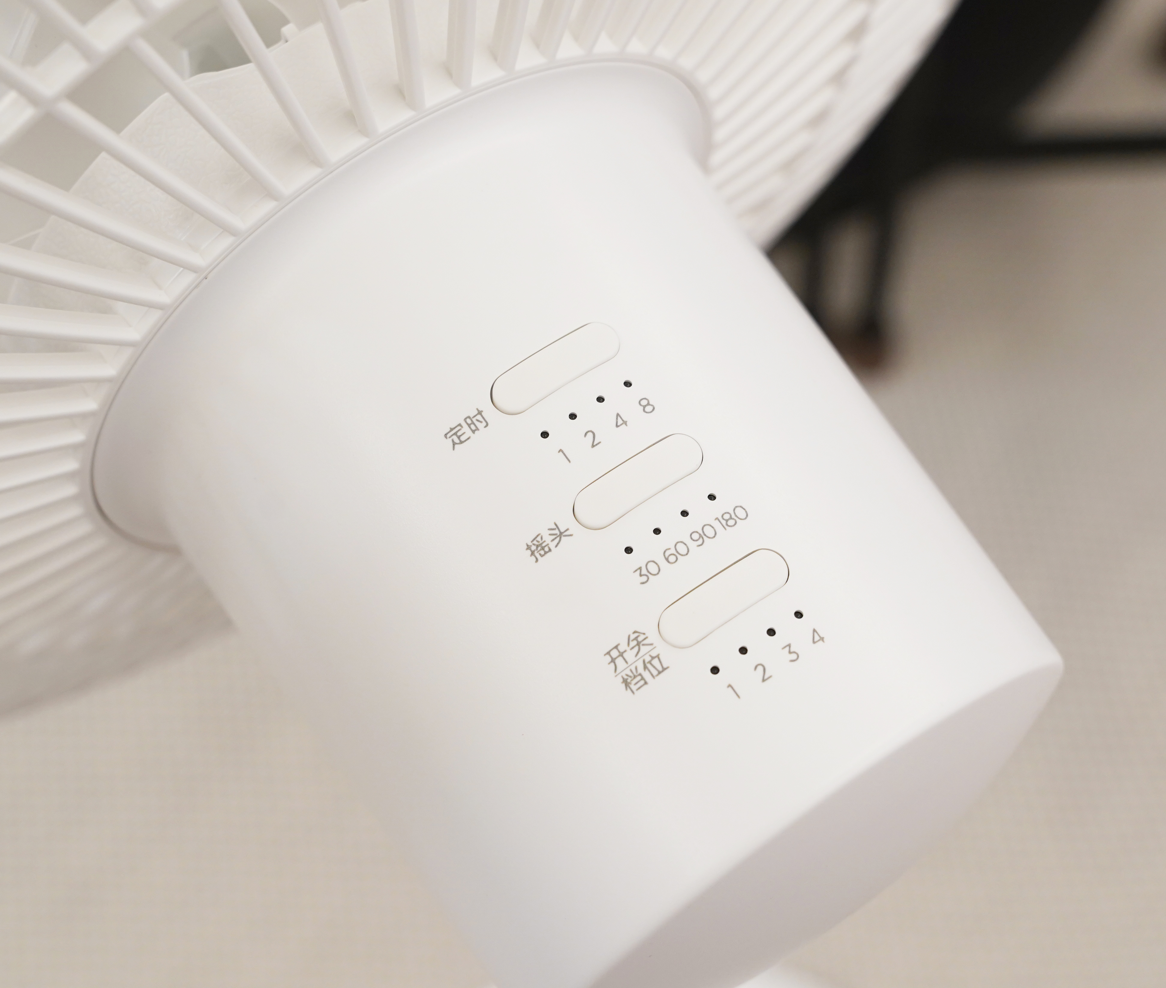 헤드 뒤쪽에는 샤오미 무선 선풍기를 컨트롤 할 수 있는 버튼이 구성되어 있습니다. 한자로 적혀 있지만 이해하기에는 어렵지 않을 정도 인데요, 전원을 ON/OFF하는 기능을 포함해 바람세기라던가 헤드 각도 조절 및 타이머 기능까지 두루 갖추고 있는 모습입니다.