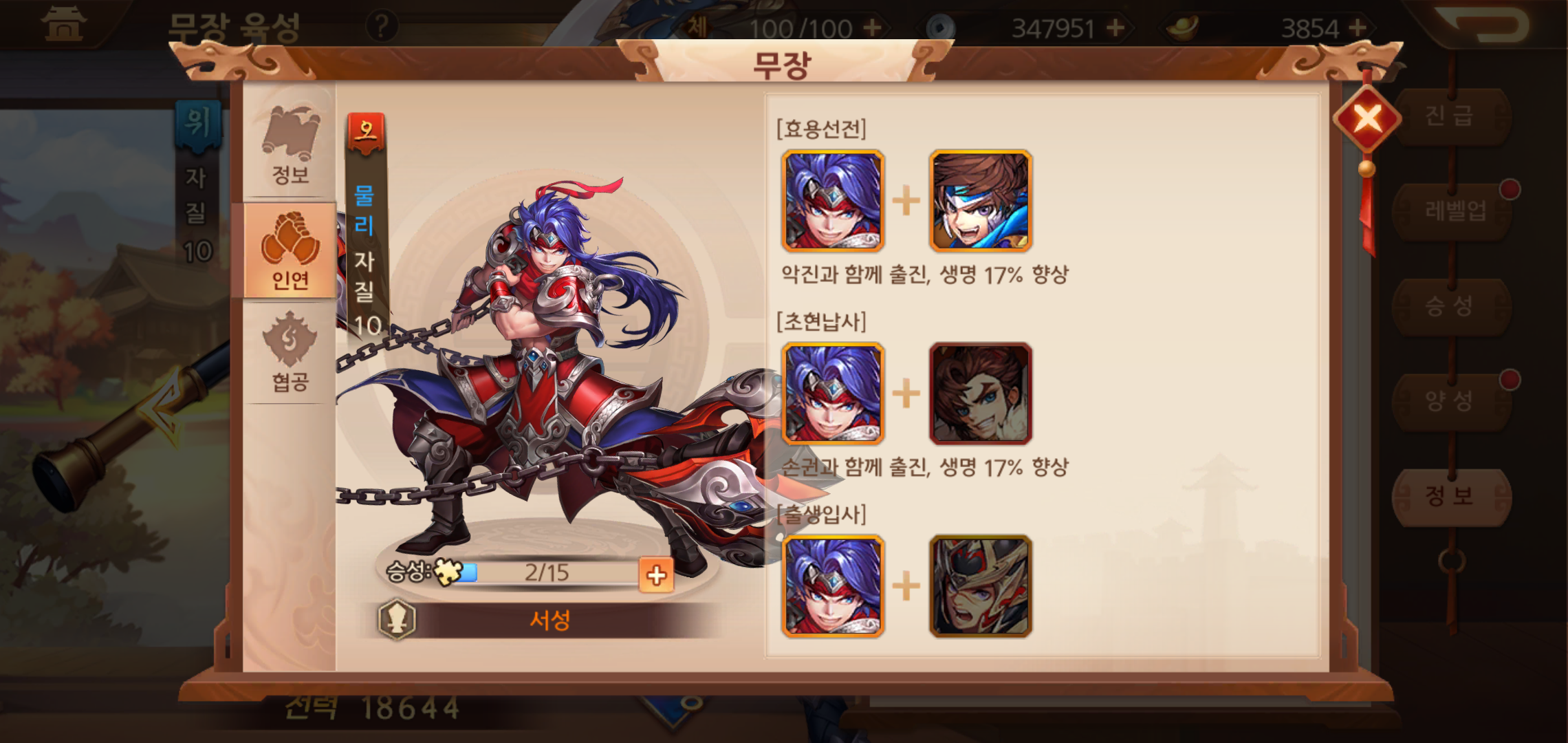 무장들은 협공을 통한 공격적인 스킬을 발휘할 수도 있지만, 인연을 통한 능력치를 향상시킬 수도 있어 이를 활용하는 것이 중요합니다. 아무래도 초반에는 천하로 나아가 단계별 전투를 벌이면서 무장이나 필요한 아이템을 획득 기본 전투력을 높여주는 것이 무엇보다 중요한 부분이구요.