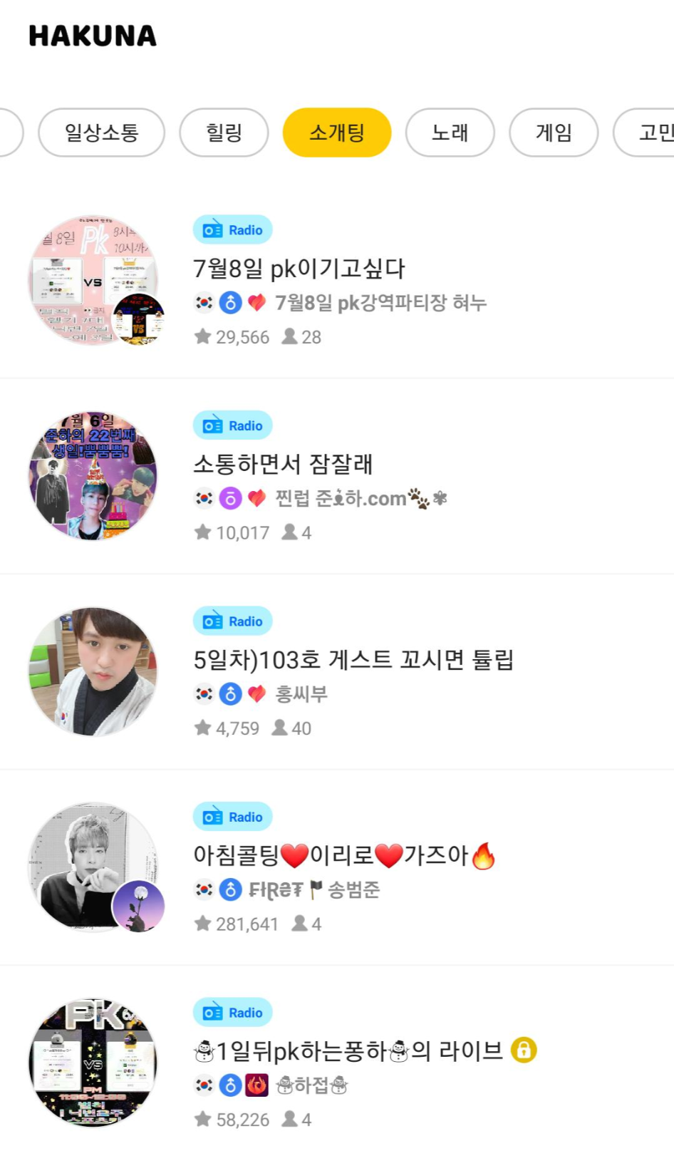 방송을 선택할 수 있는 카테고리 역시 한 두개에 그치지 않고 폭 넓은 선택을 할 수 있다는 점도 장점입니다. 라이브 방송 어플이라고 해서 다른 어플들을 보면 많아야 서너개 정도이지만 하쿠나 라이브는 일상소통부터 시작해 힐링, 소개팅, 노래, 게임 등등 일일이 나열하기에도 숨이 찰 정도여서 골라 시청하는 재미가 있다고 할까요?
