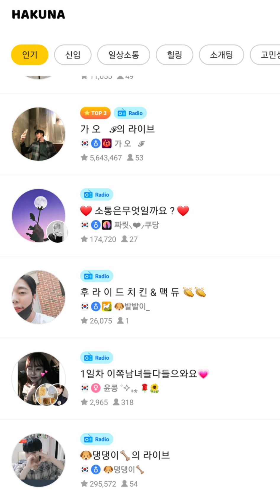 하쿠나 라이브의 경우 이미 주변 분들도 다들 알고 계실 정도로 인지도가 상당하더군요. 핸드폰만 있으면 비디오든 라디오든 원하는 방송을 선택해 시청가능한 점도 좋지만, 단순히 호스트의 방송을 시청하는 것에 그치지 않고 방송에 참여도 가능하고, 소통하면서 즐길 수 있다는 장점이 눈에 띄었습니다.