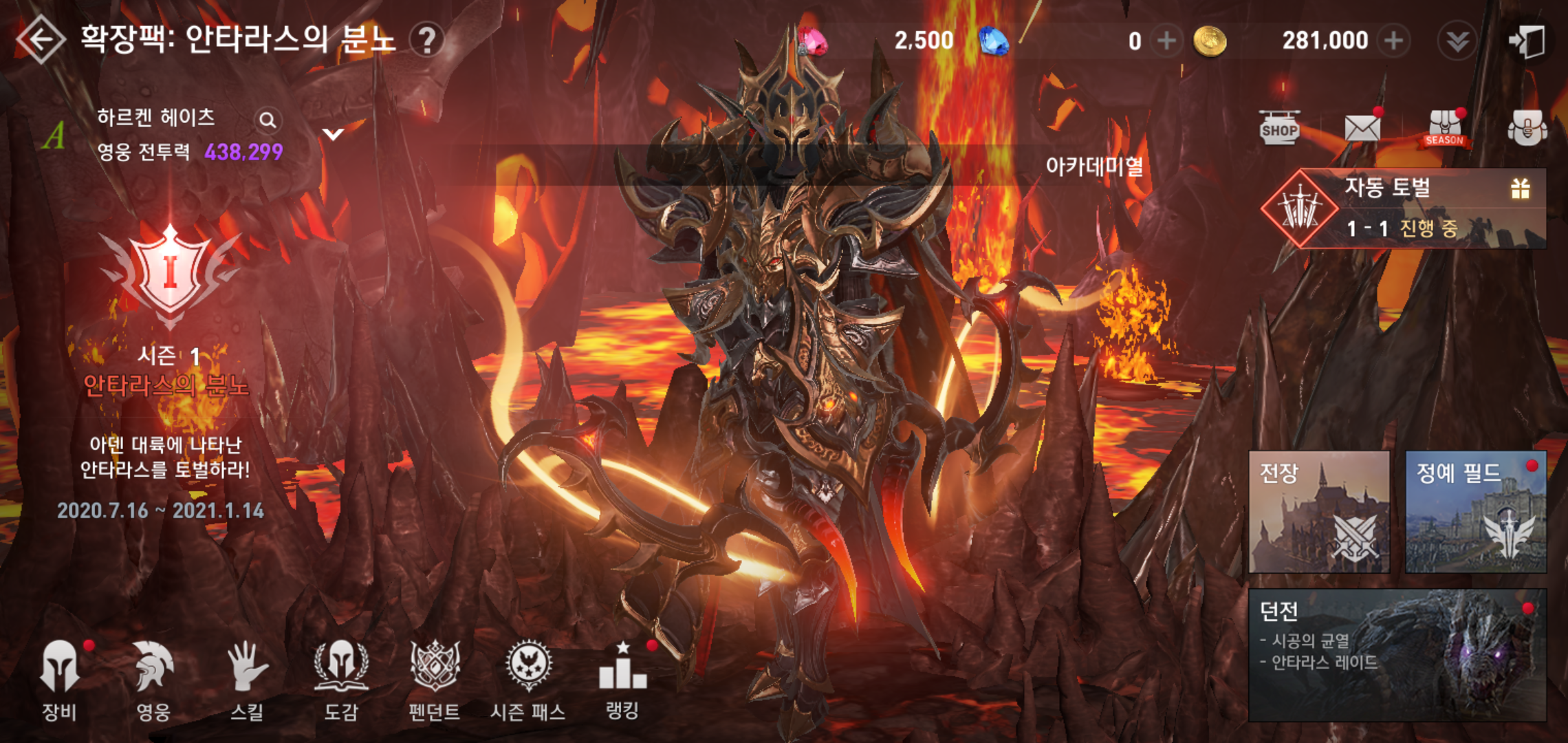 320레벨로 시작해 빠른 레벨업이 가능한 리니지2 레볼루션! 신규 캐릭터 생성과 함께 퀘스트를 진행하면서 프롤로그 8 엘모아덴 연합군을 클리어 하면 자유롭게 확장팩 시즌이 가능합니다. 확장팩 시즌 안타라스의 분노의 경우 초창기 영웅 캐릭터 4종만 플레이 가능합니다.