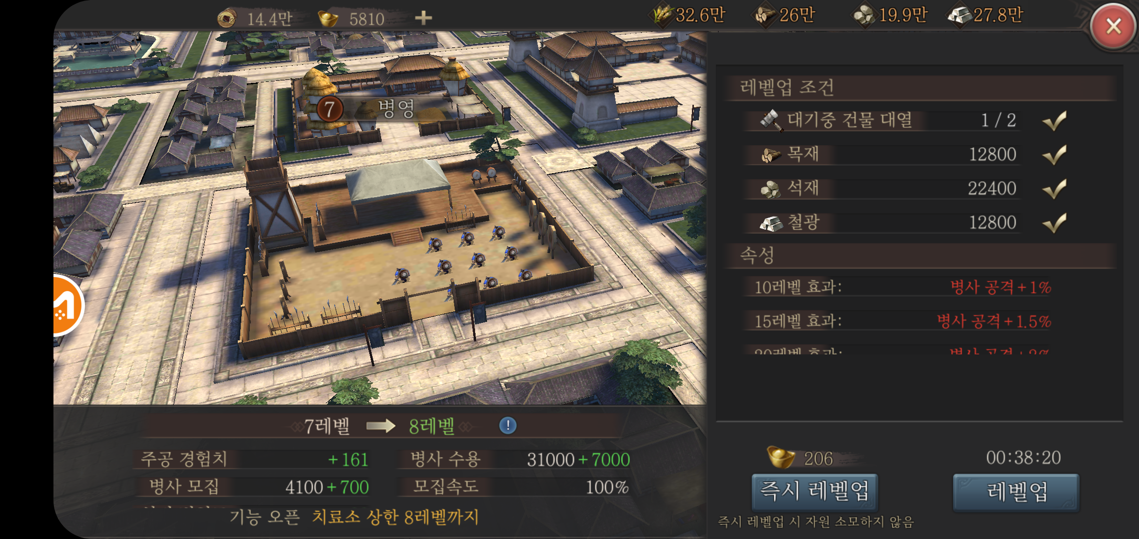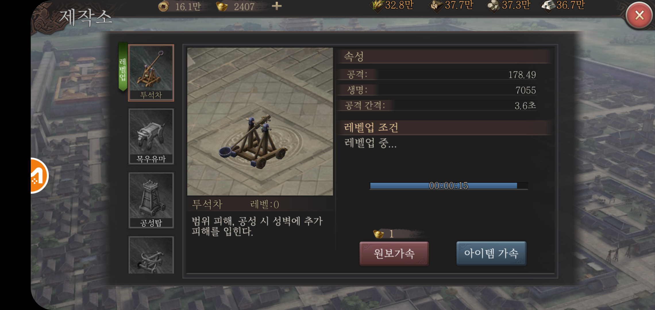 주성에 위치한 건물들은 병사를 모집하고, 전투에 필요한 투석차등 필요한 장비를 만들고 계책을 세워 전투에서 보다 유리하게 사용할 수 있습니다. 때문에 대전 레벨업과 주성 건물들의 레벨업은 필수적인데요, 건물대기열을 쉬지 않고 돌리고, 각종 전투와 보상으로 획득한 아이템 가속을 사용하면 보다 빠르게 레벨업을 할 수 있어 무조건 대전 10레벨은 빠르게 올리고 진행하는 것이 좋습니다.