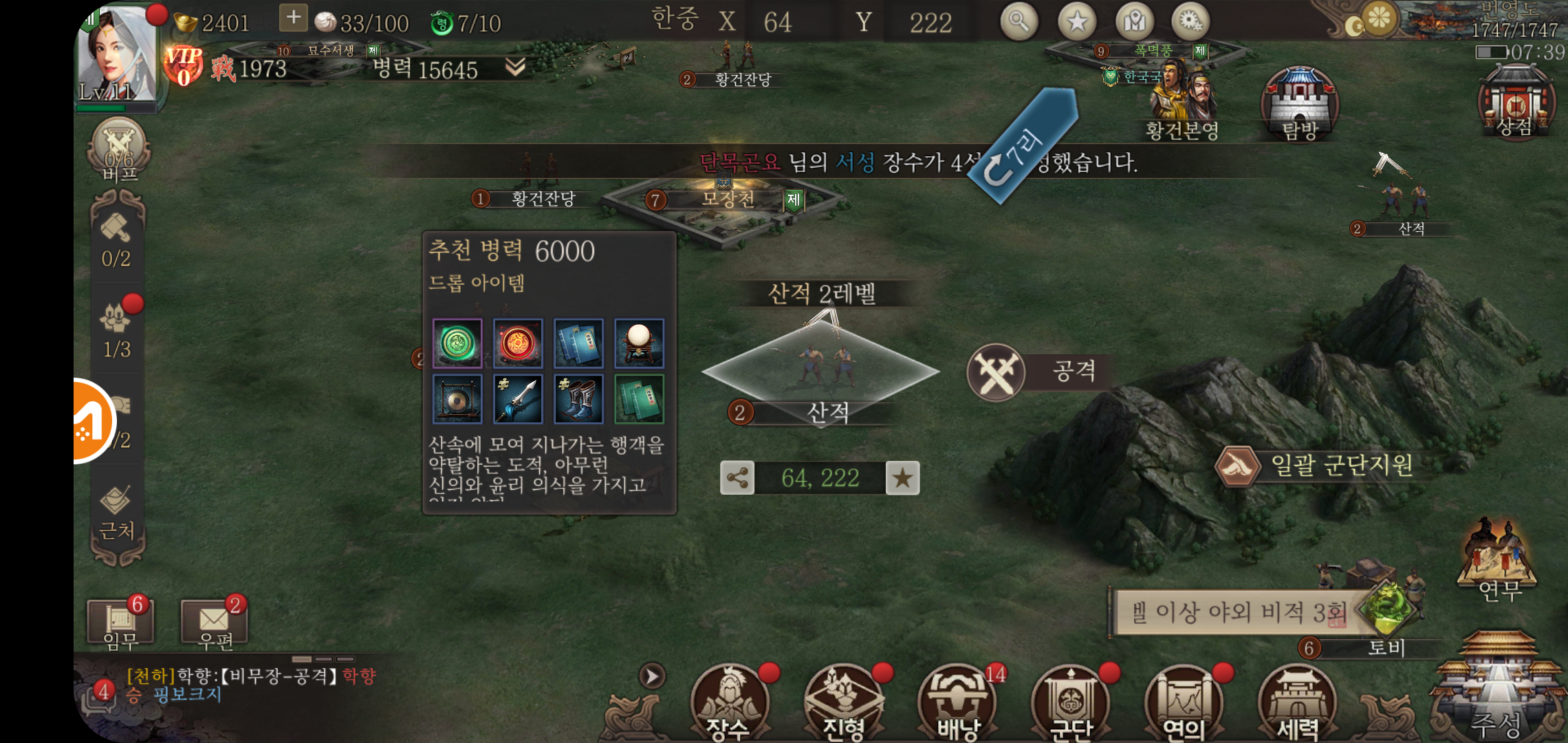 천하로 나아가면 주변에 위치한 산적이나 도적들을 상대하게 되는데요, 연무로 진행하는 전투와 달리 이동하는데 시간이 걸리고, 별다른 화면으로 넘어가지 않고 제자리에서 전투가 벌어지게 됩니다. 전투를 실행하기 전 획득할 수 있는 아이템과 전투력을 확인할 수 있어 현재 전투력에 맞는 선택이 가능합니다. 전투력으로 우위를 따져보고 전투를 진행해야 하는 건 이동에 걸리는 시간이 있기 때문인데요, 연무와 달리 전투에 걸리는 시간보다 이동시간이 배로 드는 만큼 이를 잘 활용해야 합니다.