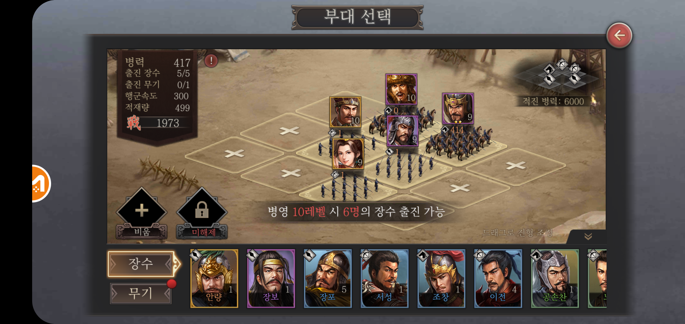 천하로 나아가 전투를 벌이기 위한 무장들은 모집소를 통해 전설부터 고급등급까지 다양하게 수집할 수 있고, 레벨업을 올리거나 장비를 착용하는 등 다양한 방법으로 전투력을 올려줄 수 있습니다. 특히 전투에 나서기 위한 전투 배치의 경우 병영 레벨에 따라 출전 장수 인원이 달라지고, 그에 따른 조합도 다양하게 설정할 수 있어 같은 무장을 보유하고 있더라도 각기 다른 전략으로 전투를 진행하게 됩니다.