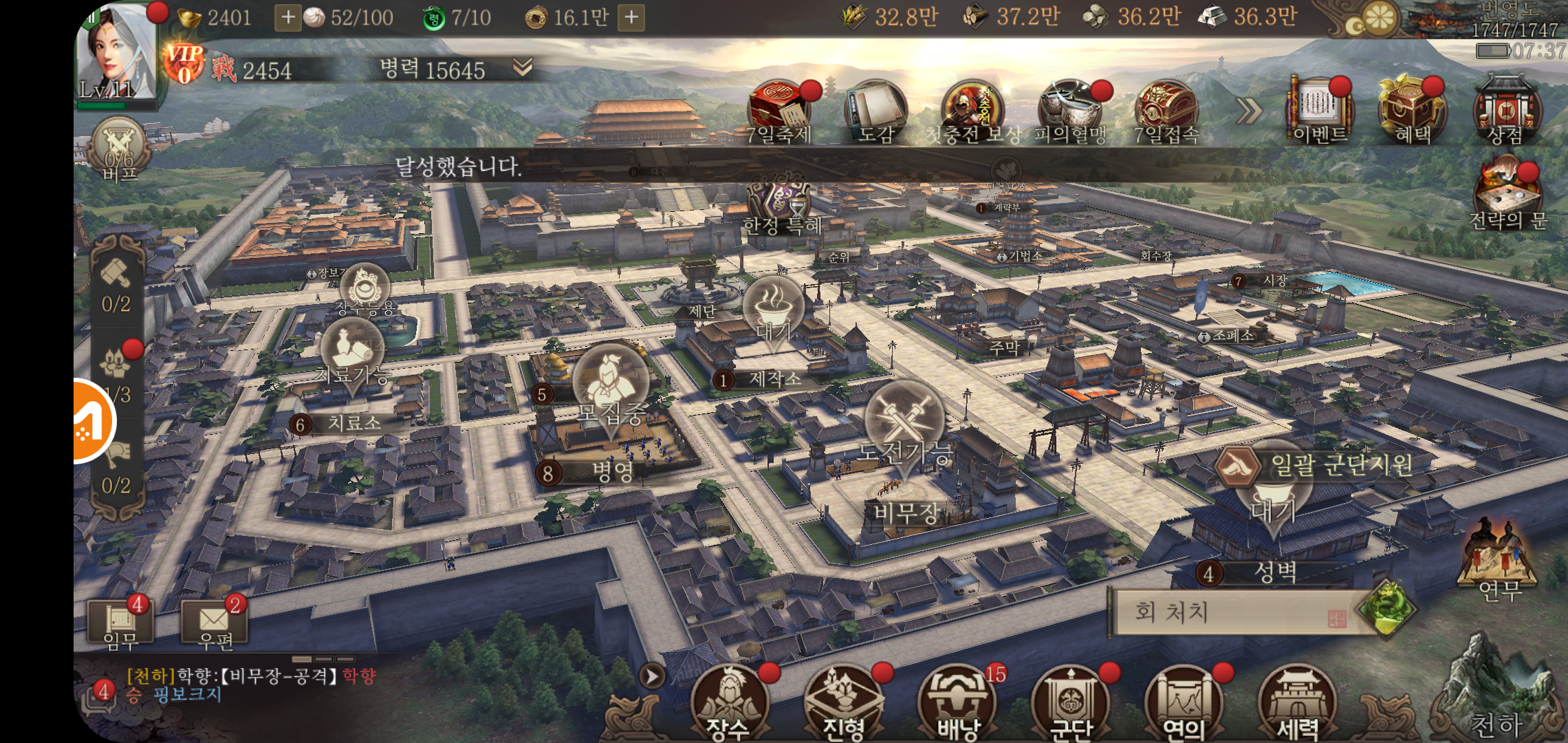 모바일SLG추천 삼국지전략은 먼저 주성을 성장시키는 것이 우선됩니다. 주성의 각 건물들은 대전 레벨에 따라 최대로 성장할 수 있는 레벨이 정해지기 때문에 초반에는 대전 레벨을 올리기 위한 기반 시설을 함께 올리는 것이 유리합니다. 건물 레벨을 올리면서 주어진 임무에 따른 보상을 수령하면 대전을 10레벨까지 올리는데 채집과 사냥을 일일이 챙기지 않아도 자원은 충분합니다.