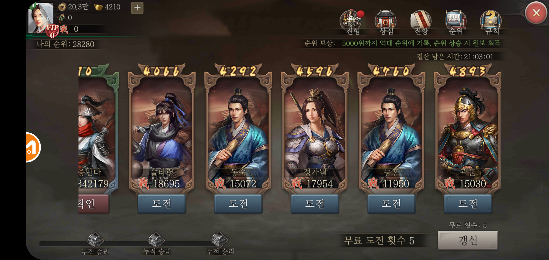 천하로 나아가 다른 유저들의 주성을 공략하여 세력을 넓히는 것 외에 경기장을 이용한 랭킹전도 준비되어 있습니다. 천하에서 이동하는 거리시간이 없고, 연무에서 진행하는 전투 방식으로 경기가 진행되는데요, 다른 유저들이 사용하는 무장이나 진형을 참고 하여 전투력을 올리는데 도움을 받을 수 있기도 합니다. 랭킹이 올라갈 수록 획득가능한 보상은 덤이고 말이죠.