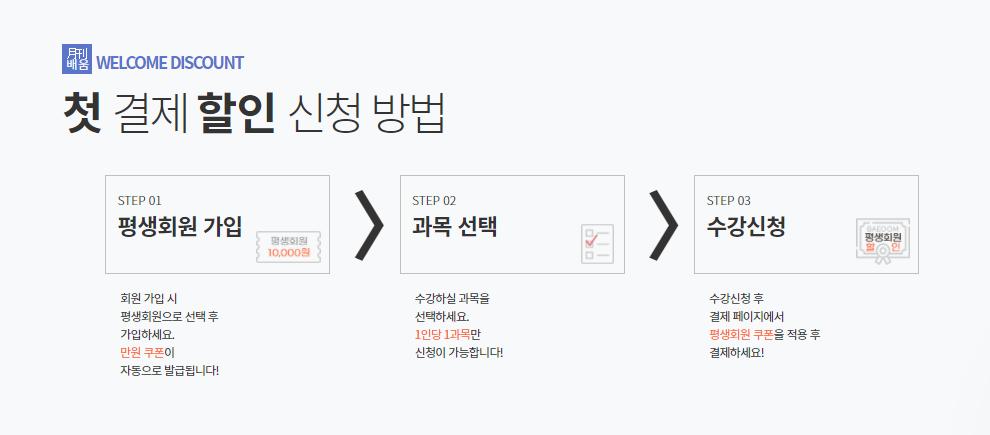 필요한 수강 과목에 대하여 할인을 받는 방법도 간단합니다. 평생회원 가입 후 자동으로 발급되는 만원쿠폰을 시용하는 방법으로, 수강 과목을 선택하고, 결제페이지에서 평생회원 쿠폰을 적용하여 결제하면 첫결제 할인을 받은 수강료 결제가 이뤄지는 방식입니다.