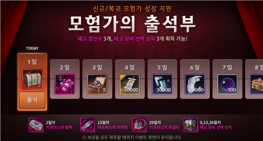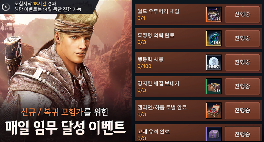 플레이만 꾸준히 즐겨도 자연스럽게 참여 가능하고, 획득 가능한 보상이 가득한 인게임 이벤트도 구성되어 있습니다. 이제 막 시작하는 신규 모험가와 복귀 모험가를 위한 매일 임무 달성 이벤트는 기본 모험가 출석부를 통해 상당한 아이템을 보상으로 받을 수 있어 장비를 맞춰야 하는 부담을 크게 덜어 낼 수 있기도 합니다.