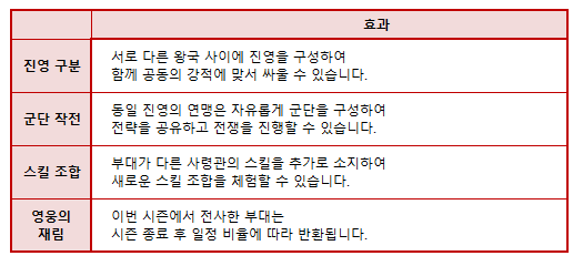 특히 이번 업데이트의 경우 새로운 진영 전투와 스킬 조합 효과가 추가되었습니다. 서로 다른 왕국 사이에 진영을 구성해 공동의 강적에 맞서 전투를 벌일 수 있기도 하고, 부대가 다른 사령관 스킬을 추가로 소지해 새로운 스킬 조합 체험도 가능해 더욱 전략적인 재미를 즐길 수 있을 것 같습니다.