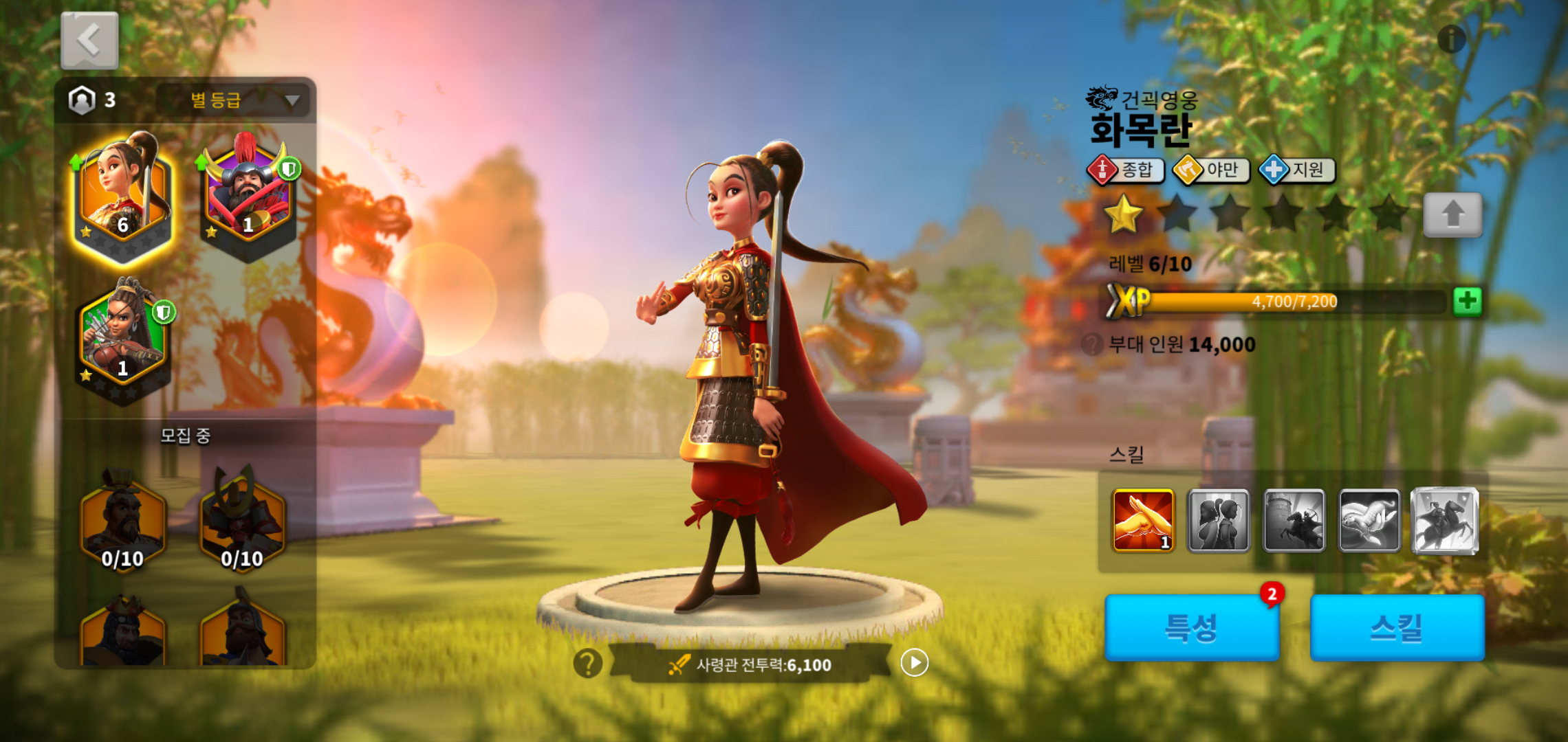 중국 건곽영웅 화목란의 경우 전설급 사령관이기 때문에 초반 왕국을 건설하는데 많은 도움을 받을 수 있는데요, 이벤트 기간동안 화목란 성장에 따른 추가 보상도 받을 수 있기 때문에 신규 유저, 복귀유저 할 것 없이 상당한 도움을 받을 수 있습니다.