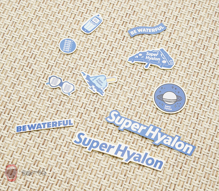 푸르른 바다가 연상되는 VT 슈퍼 워터풀박스 한정판을 열어보니 슈퍼히알론 집중케어제품과 함께 리플렛 엽서, 코믹북, 스티커패키지, 콜드컵 그리고 핀뱃지와 슈퍼히알론 양말까지 깨알 구성으로 준비되어 있었습니다! 굿즈는 실용성 넘치는 제품들로 구성되어 있어 더욱 마음에 들더군요.