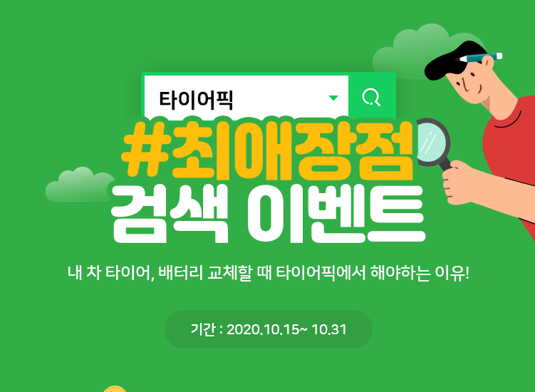 배터리교체부터 타이어 교체까지 더할 나위 없는 타이어픽에서는 10월 31일까지 #최애장점 검색이벤트가 진행되어 푸짐한 선물을 받아볼 수 있습니다. 이번 기회에 타이어도 알아보고 이벤트에 참여하는 꿩 먹고 알 먹는 일거양득의 기회라고 할까요?