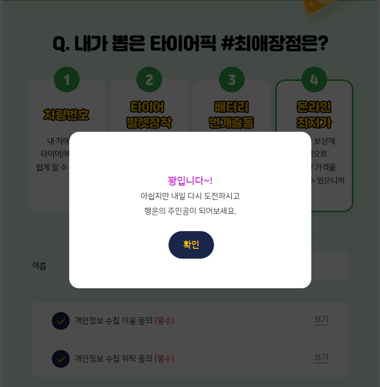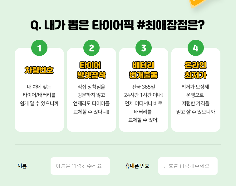 타이어픽 #최애장점 이벤트에 보이는 4개의 보기 중 본인이 선택하는 #최애장점을 선택한 후 이름과 휴대폰 번호를 입력한 후 이벤트 참여하기 버튼을 누르면 바로 결과를 확인할 수 있습니다. 4개의 보기는 타이어픽의 장점을 하나씩 나열했기 때문에 정답이 없는 만큼 본인이 생각하는 답을 선택하면 됩니다.