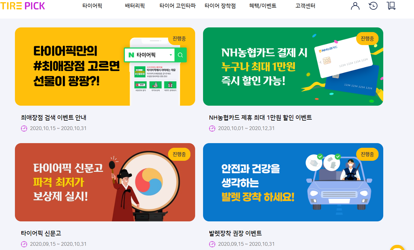 이 외에도 타이어픽에서는 다양한 이벤트가 진행되고 있습니다. 아무래도 타이어 교체와 배터리 교체 시기를 고민하던 분들이라면 더할 나위 없는 혜택으로 진행할 기회가 아닐까 싶은데요, 합리적인 비용과 스마트한 편리함까지 모두 갖춘 타이어픽에서 보다 만족스러운 서비스를 받아보시기 바랍니다!