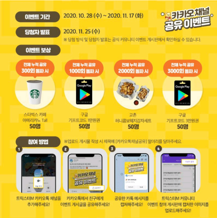 카카오톡 채널 공유이벤트도 11월 17일까지 진행되는데요, 공유 횟수에 따라 주어지는 선물이 점점 많아지고 다양해지는 만큼 함께 즐기고 싶은 친구나 지인이 있다면 서둘러 트릭스터M 카카오채널을 공유하여 선물의 주인공이 되어 보는 것도 좋을 것 같습니다.