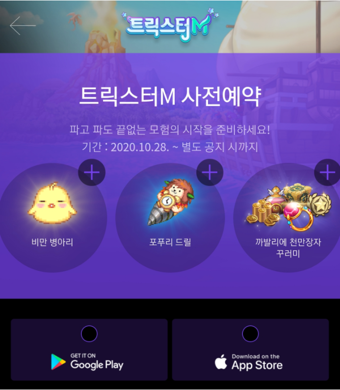 신작모바일게임 트릭스터M 사전예약은 10월 28일을 시작으로 현재 진행 중입니다. 사전예약에 참여한 모든 인원에게 비만병아리, 포푸리 드릴 그리고 까발리에 천만 상자 꾸러미가 선물로 주어집니다. 까발리에 천만 상자 꾸러미에는 태초의 모험가 칭호를 비롯해 포션과 주문서에 이르기까지 풍성한 구성으로 준비되어 있다고 하니 놓치면 무척이나 아쉬울 것 같습니다.