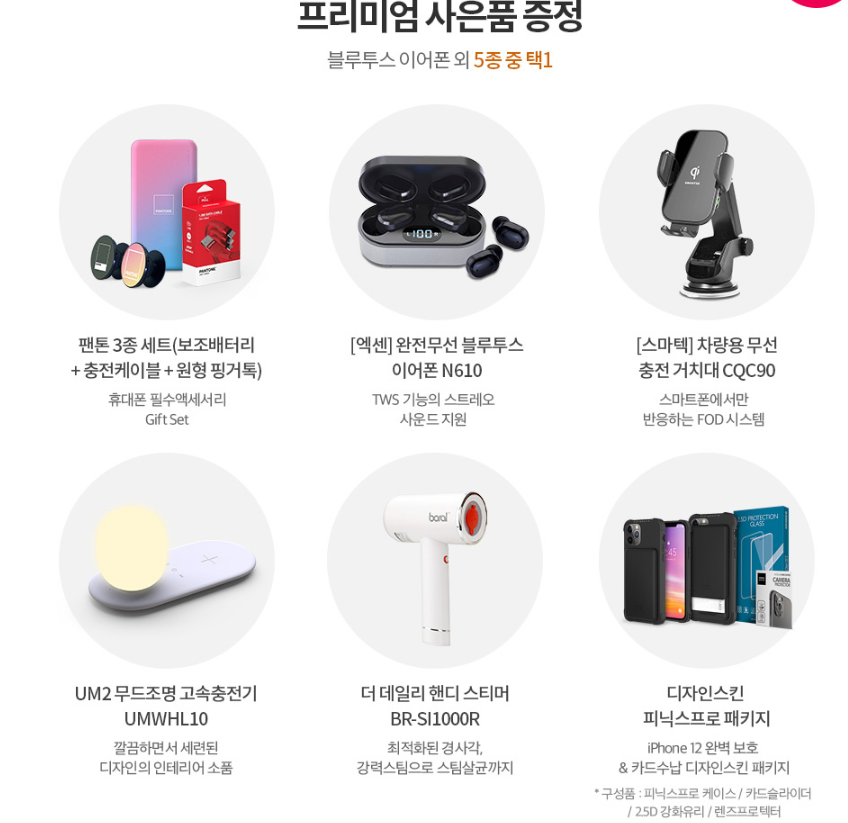 먼저 유플러스 아이폰12사전예약에 참여했다면 프리미엄 사은품을 받을 수 있습니다. 팬톤 3종 세트부터 액센 완전 무선 블루투스 이어폰, 스마텍 차량용 무선 충전 거치대, 디자인스킨 피닉스프로 패키지등 총 6가지 사은품 중에 한가지를 선택하여 받을 수 있습니다.