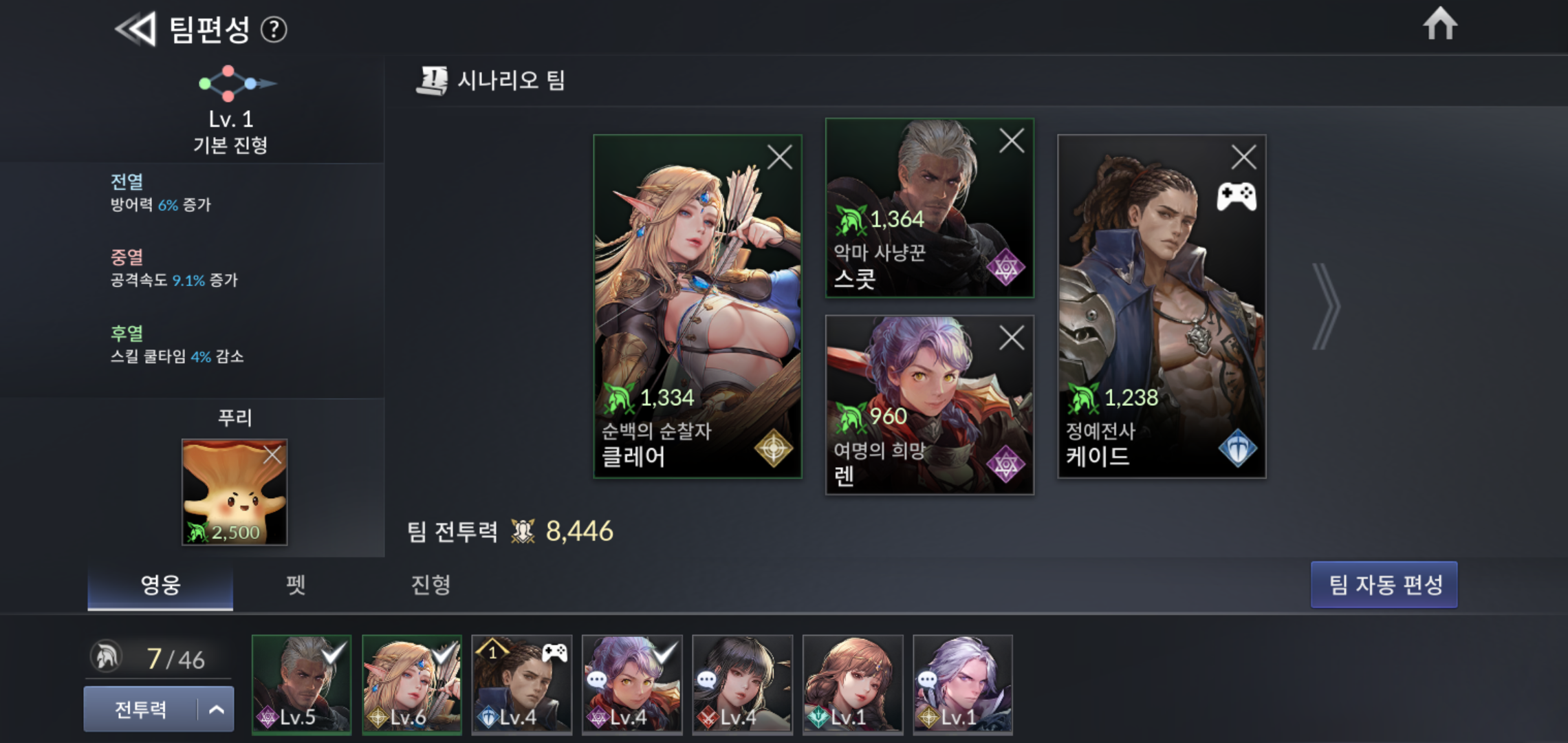 팀을 구성하는 영웅들 외에도 펫을 팀으로 구성해 도움을 받을 수 있기도 합니다. 초반에 획득 가능한 아기 버섯 푸리를 시작으로 각기 다른 패시브 스킬과 전투력을 가진 펫을 팀으로 편성하면서 보다 수월한 전투를 치를 수 있습니다. 펫이 가진 스킬을 적재적소에 사용하는 것 또한 중요하구요.