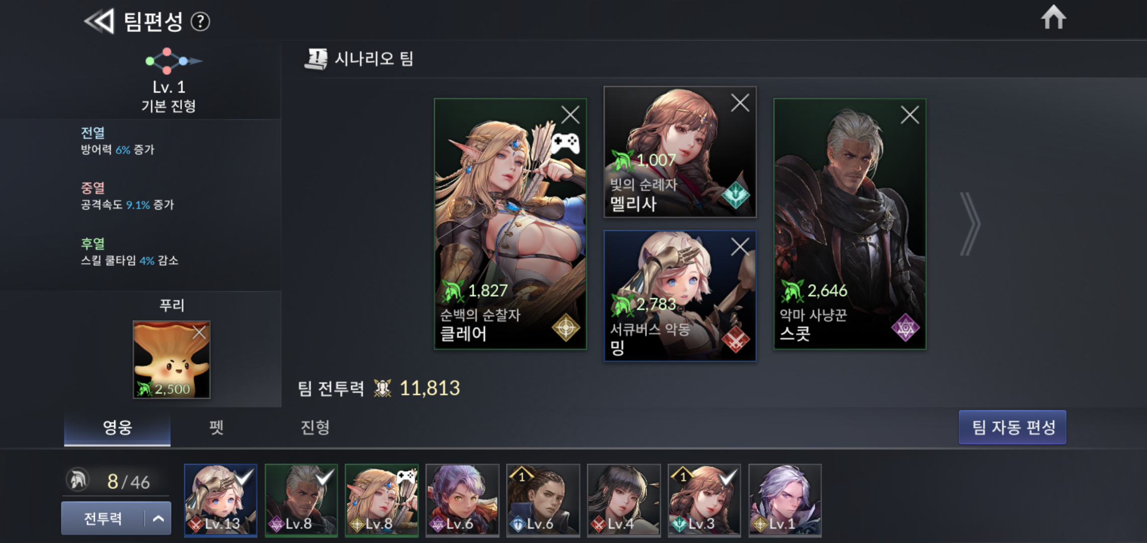 팀의 전투력을 상승시키고, 펫 스킬로 전투에 도움을 받을 수 있기 때문에 진형에 펫을 설정하는 것도 중요합니다. 초반 푸리가 가진 스킬은 영웅 생명력을 회복시켜주기 때문에 위급한 상황에서 상당한 도움을 받을 수 있습니다. 여기에 패시브 스킬로 공격력과 방어까지 올려주니 꼭 챙겨야 하구요.