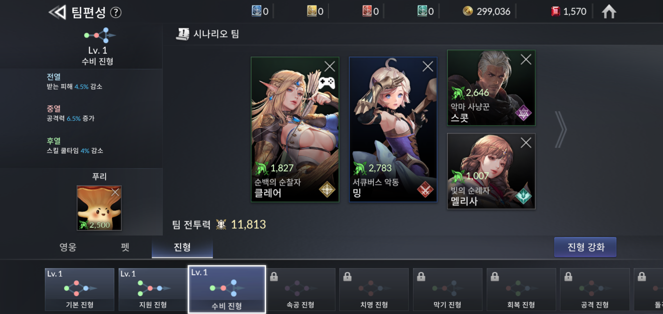 팀편성만큼 중요한 부분이 바로 진형입니다. 튜토리얼을 마무리 하면 기본 진형을 포함해 지원 진형, 수비 진형 총 3개의 진형이 오픈되어 선택 할 수 있습니다. 진형은 전투를 하다 보면 흩어지기 때문에 뭔 필요가 있을까 싶지만, 좌측 상단에 표기된 내용처럼 각 진형 마다 전열, 중열, 후열에 각기 다른 특성이 부여되는 만큼 영웅에 맞는 진영은 필수적입니다. 탱딜힐 기본에 충실하다면 기본진형이 좋고, 만능형 위주의 탱딜을 선두에 둔다면 수비진형도 좋은 선택 중 하나입니다.