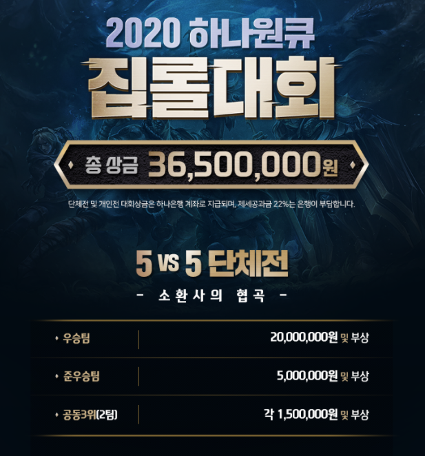 2020 하나원큐 집롤대회에서 우승한 팀과 개인에게 주어지는 총 상금은 36,500,000원! 단체전 최종 우승팀에게는 2천만원과 부상, 준우승팀에게는 5백만원과 부상 그리고 공동 3위 2팀에게는 각 150만원의 상금과 부상이 주어집니다.