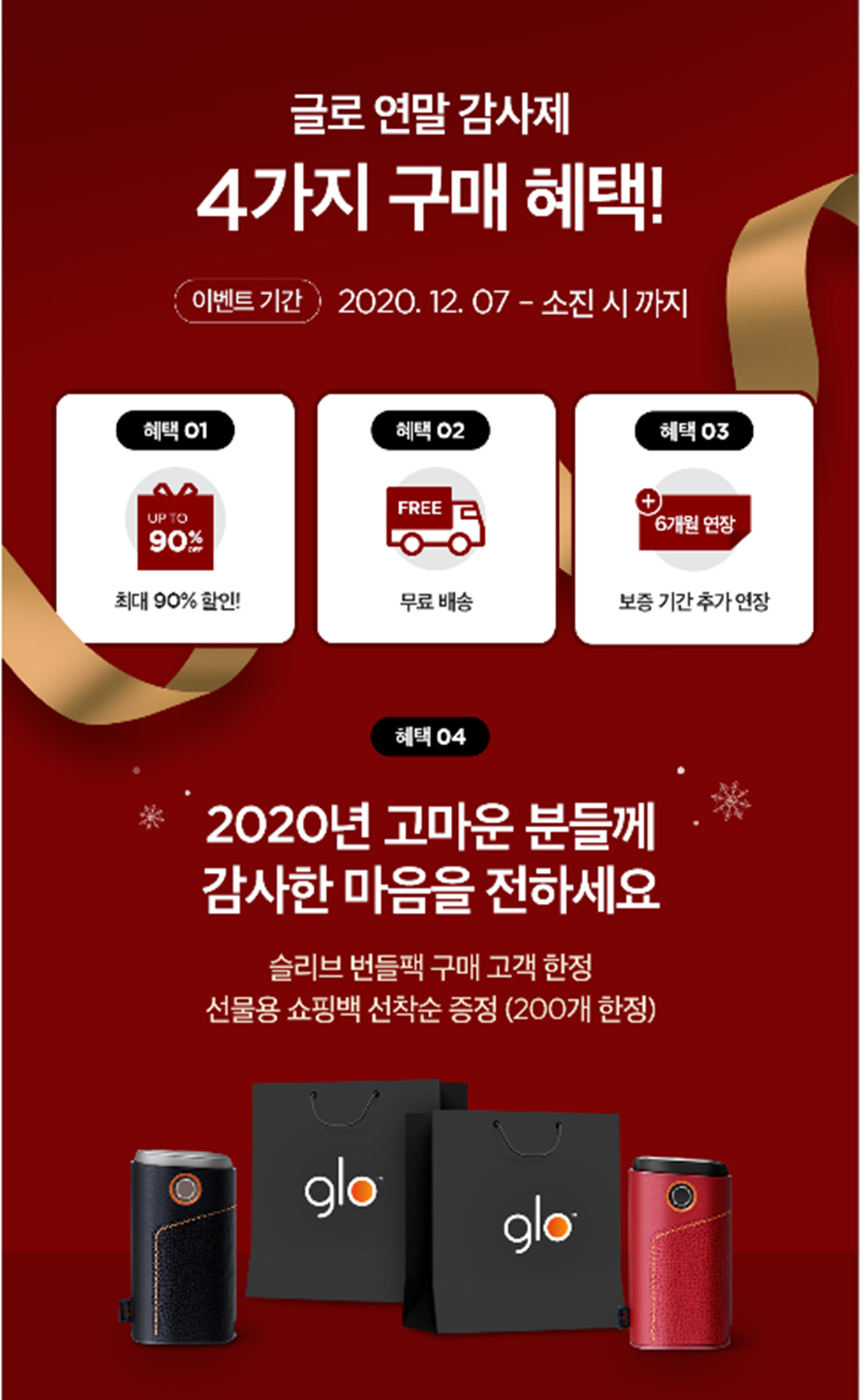 글로프로 구매를 고민하고 계신 분들이나, 연말을 맞이해 지인 선물을 고민하는 분들이라면 놓치기 아쉬운 이벤트도 현재 진행 중입니다. 먼저 글로프로 구매시 최대 90% 할인 혜택이 주어집니다. 또한 배송비가 면제되고, 보증기간도 6개월 연장 됩니다.