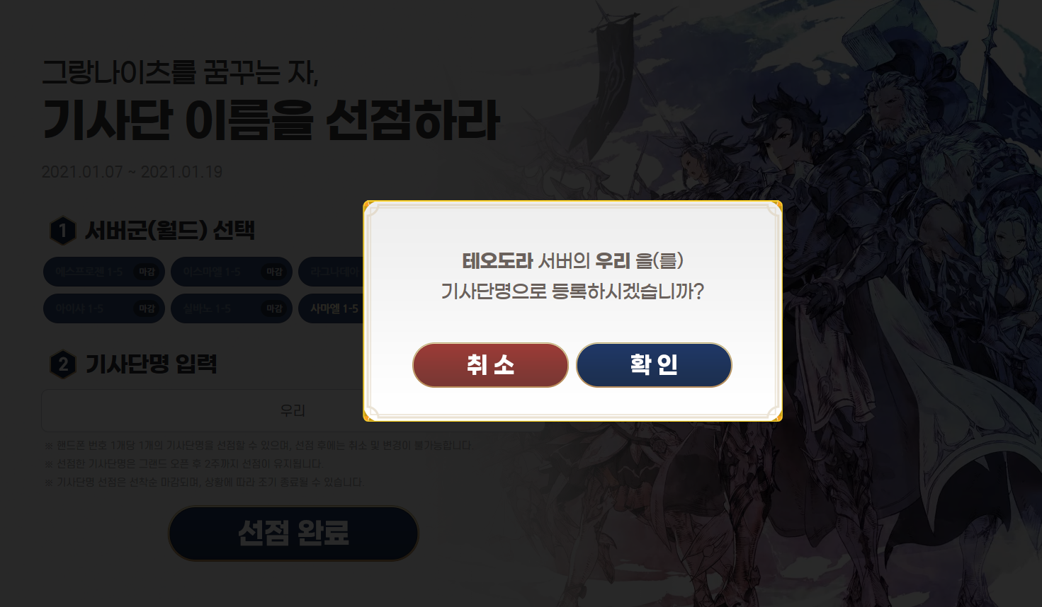 원하는 서버를 선택한 후 기사단명을 입력한 다음 선점완료 버튼을 누르면 최종 기사단명으로 등록할지 여부를 선택하게 됩니다. 마지막까지 고민이 되는 순간인데요, 여기서 확인 버튼을 눌러 최종 확정을 해야 기사단 선점이 진행됩니다.