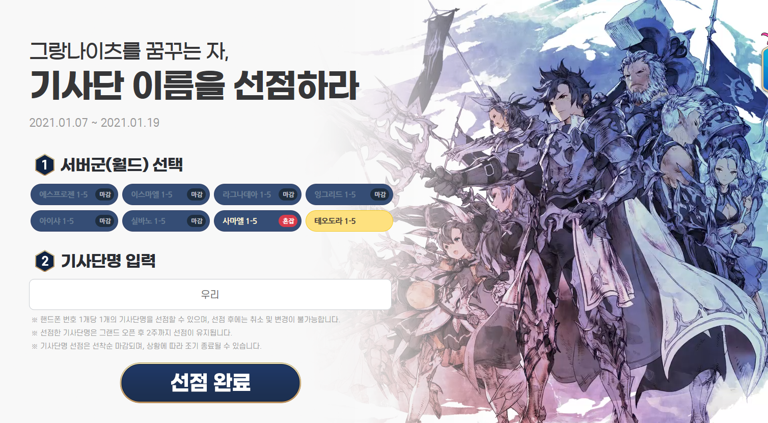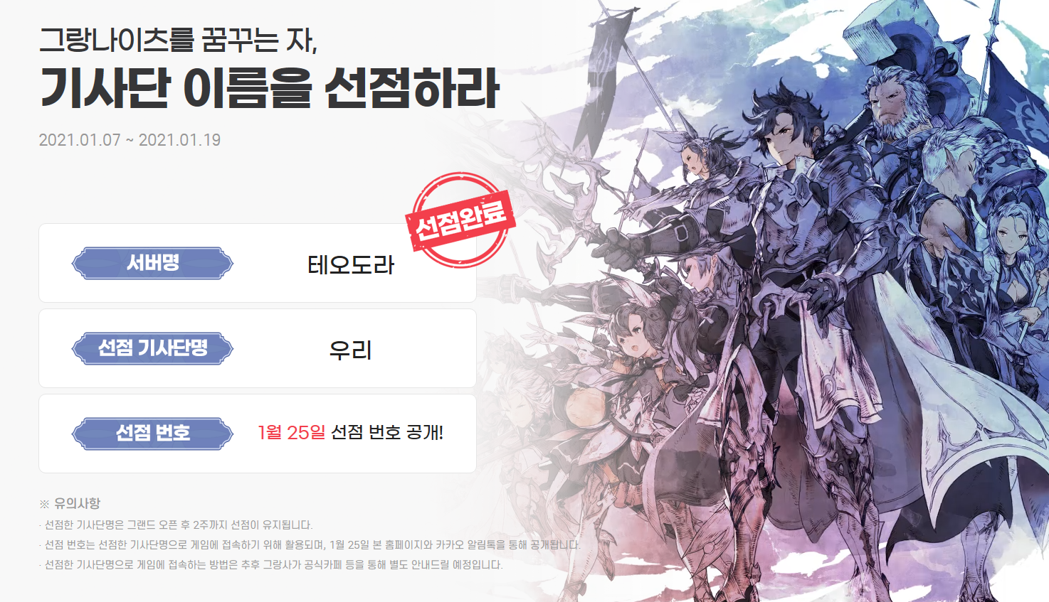 기사단명 선점 완료 버튼과 함께 선택한 서버명과 선점 기사단명을 확인하고, 최종 선점이 완료됩니다. 선점 번호는 1월 25일 이후에 공개되는데요, 그랜드 오픈 이후 선점한 기사단명으로 게임에 접속하기 위해 선점번호가 꼭 필요하다고 하는군요.