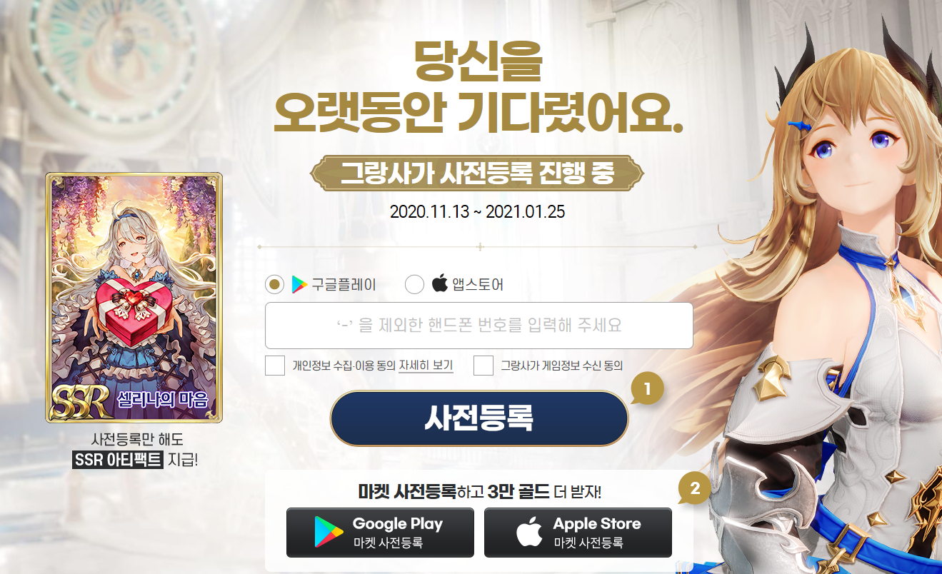 기사단명 선점을 위해선 먼저 그랑사가 사전등록을 진행해야 합니다. 본인이 사용하는 OS를 선택하고 핸드폰 번호를 입력하면 간단하게 사전등록이 가능한데요, 사전등록만 해도 SSR 아티팩트인 셀리나의 마음을 받을 수 있습니다. 추가로 마켓에서 진행하는 사전등록에 참여하면 추가 3만 골드도 더 받을 수 있고 말이죠.