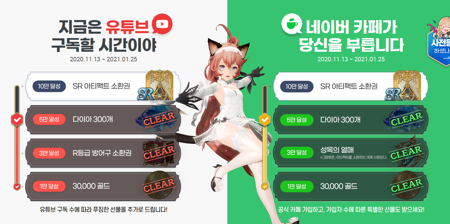 유튜브 구독 이벤트와 네이버 공식카페 가입 이벤트도 함께 진행 중입니다. 구독 인원과 가입 인원에 따라 누적 선물이 주어지는데요, 이미 마지막 단계만 남아 있는 상황이라 그리 어려움 없이 모든 선물을 받을 수 있을 것 같습니다. 특히 유튜브에서는 큐이 응원댄스 이벤트도 진행되고 있으니, 그랑사가 사전등록 및 기사단 선점을 놓치지 마시고 참여해 풍성한 선물의 주인공이 되어보시기 바랍니다!